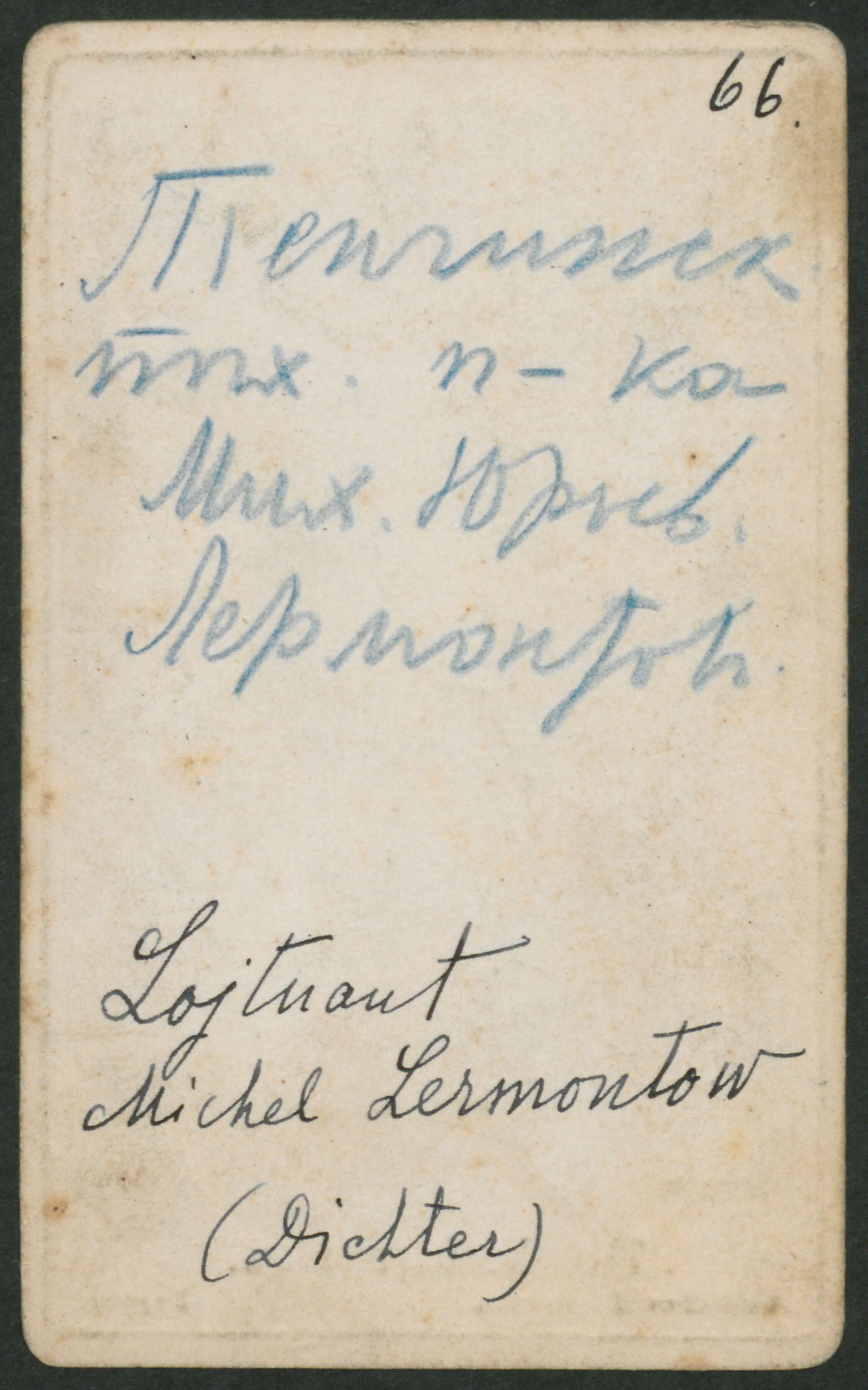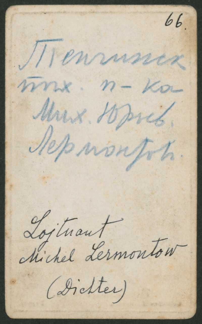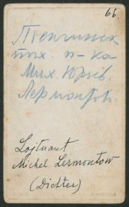 Portræt i visitkortformat af digteren Lermontov, bagside