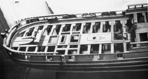 Foto: Model af "Kronen", opr. bygget 1690. (på agterspejl flg. Tekst: N. Falster. 31.).