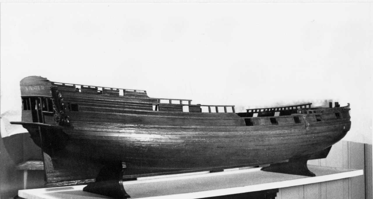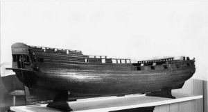 Foto: Model af "Kronen", opr. bygget 1690. (på agterspejl flg. Tekst: N. Falster. 31.).