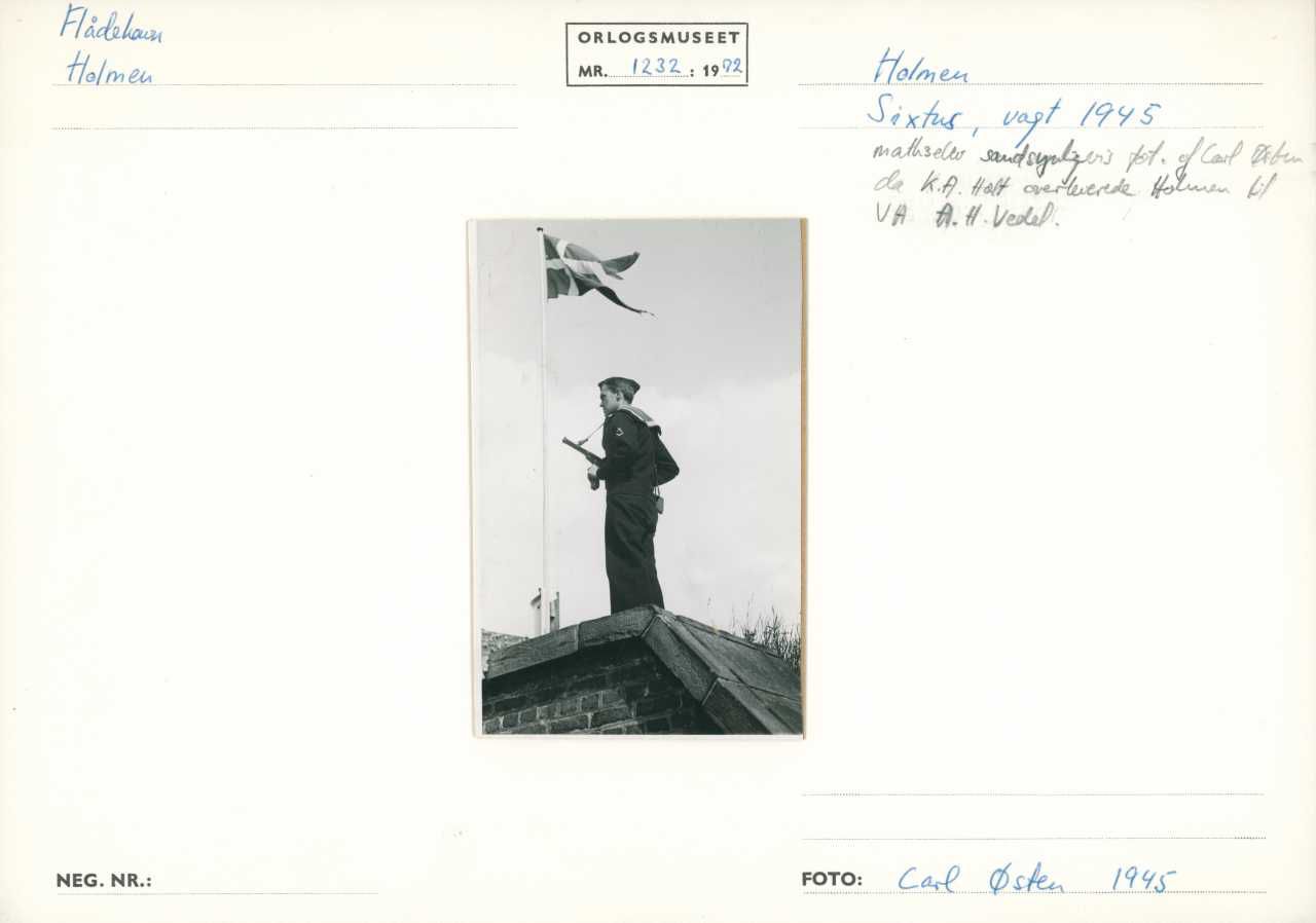 Foto: Mathelev Carl Østen på vagt ved Sixtus, 1945, da Holmen blev overleveret af de allieredes repræsentant KA Holt til VA A.I. Veddel d. 11. maj.