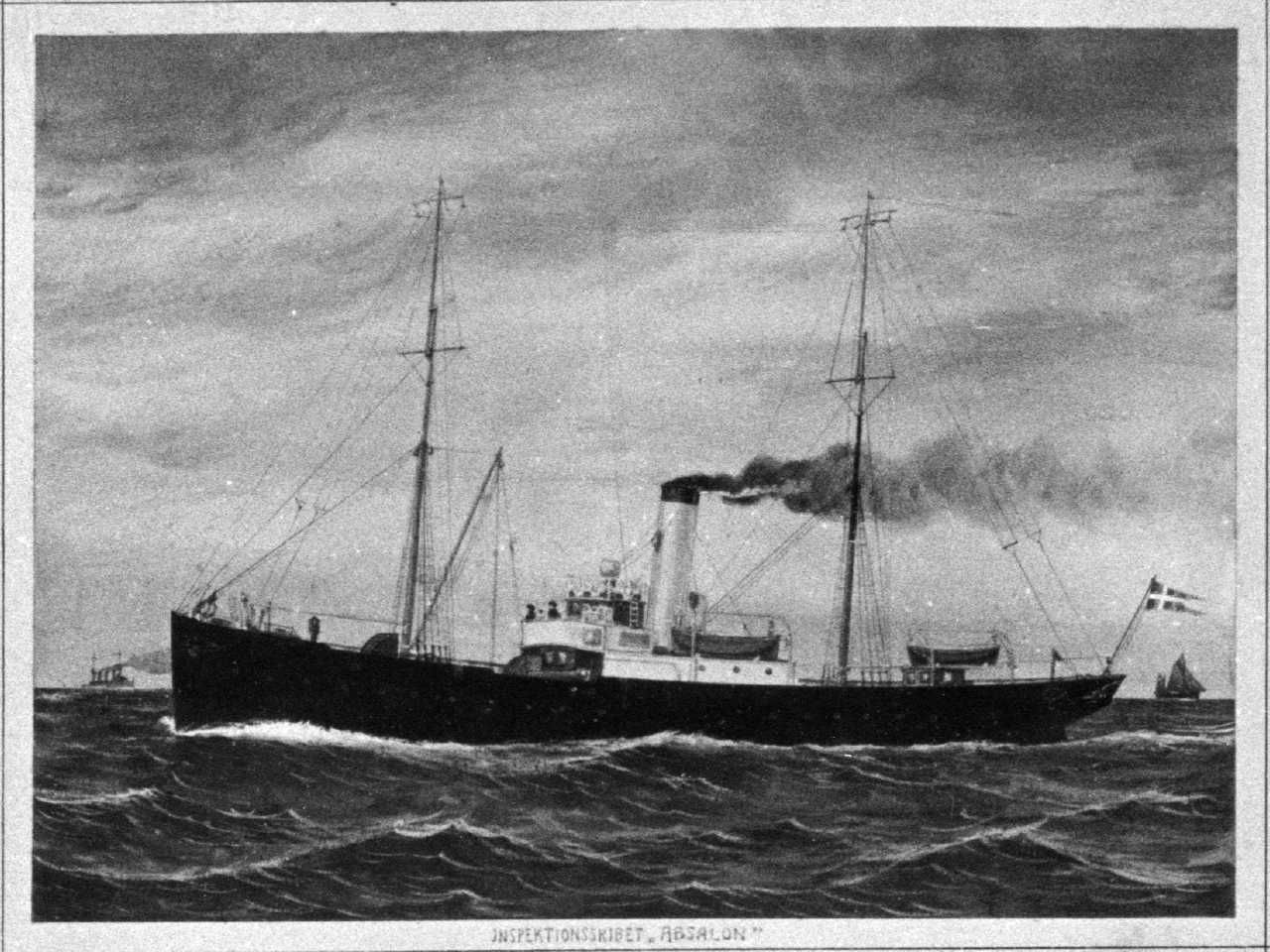 Tegning: Farvelagt tusch. "Absalon" (1911-23, ex "Løvenørn" 1877). Set mod bagbord under sejlads. I baggrunden til venstre et større orlogsfartøj, til højre en galease. I sort ramme. Sign. EINAR OLSEN.