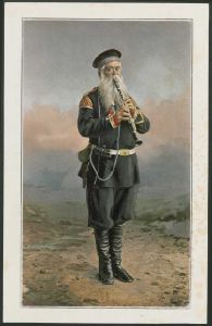 Farvelitografi af russisk regimentsmusiker, der spiller obo. Fra Gudim-Levkovitj-samlingen.