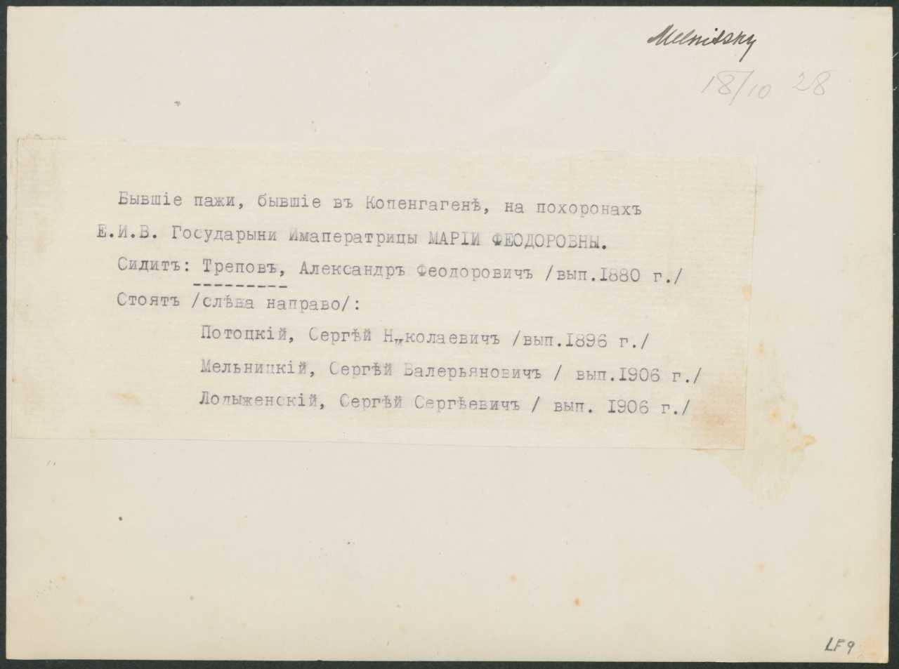 Fotografi af tidligere pager forsamlet i København ved bisættelsen af enkekejserinde Maria Fjodorovna (Dagmar) i 1928, bagside