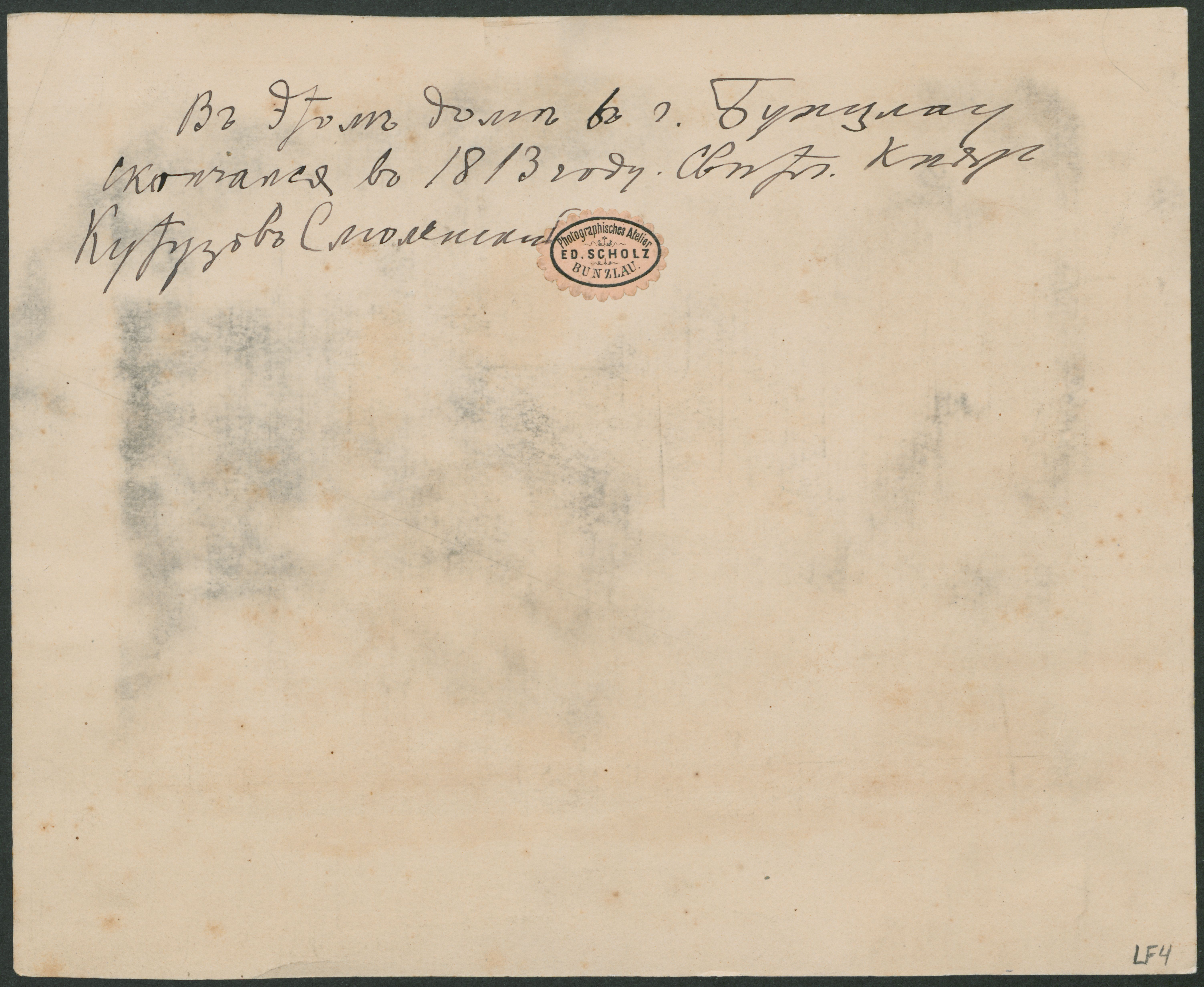 Tekst bag på billede "Den hellige fyrste Kutusov-Smolenskij døde i dette hus i Buntslau i 1813."