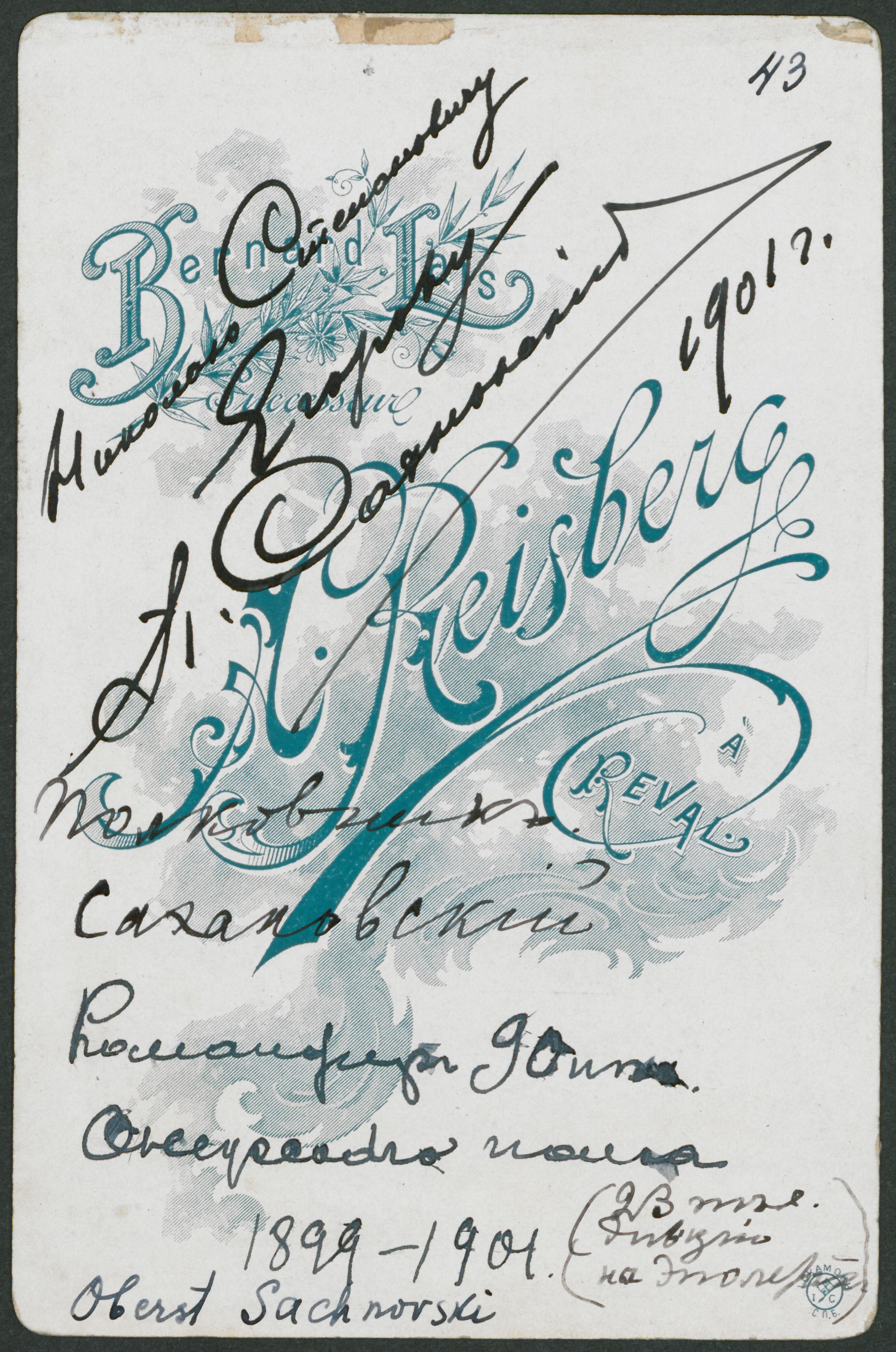 Portrætfotografi af oberst P.G. Saknovskij - Павел Григорьевич Сахновский - dedikeret til Nikolaj Stepanovitj Egorov - Николай Степанович Егоров (1870 - 1934), taget i Reval - Tallinn, 1901.