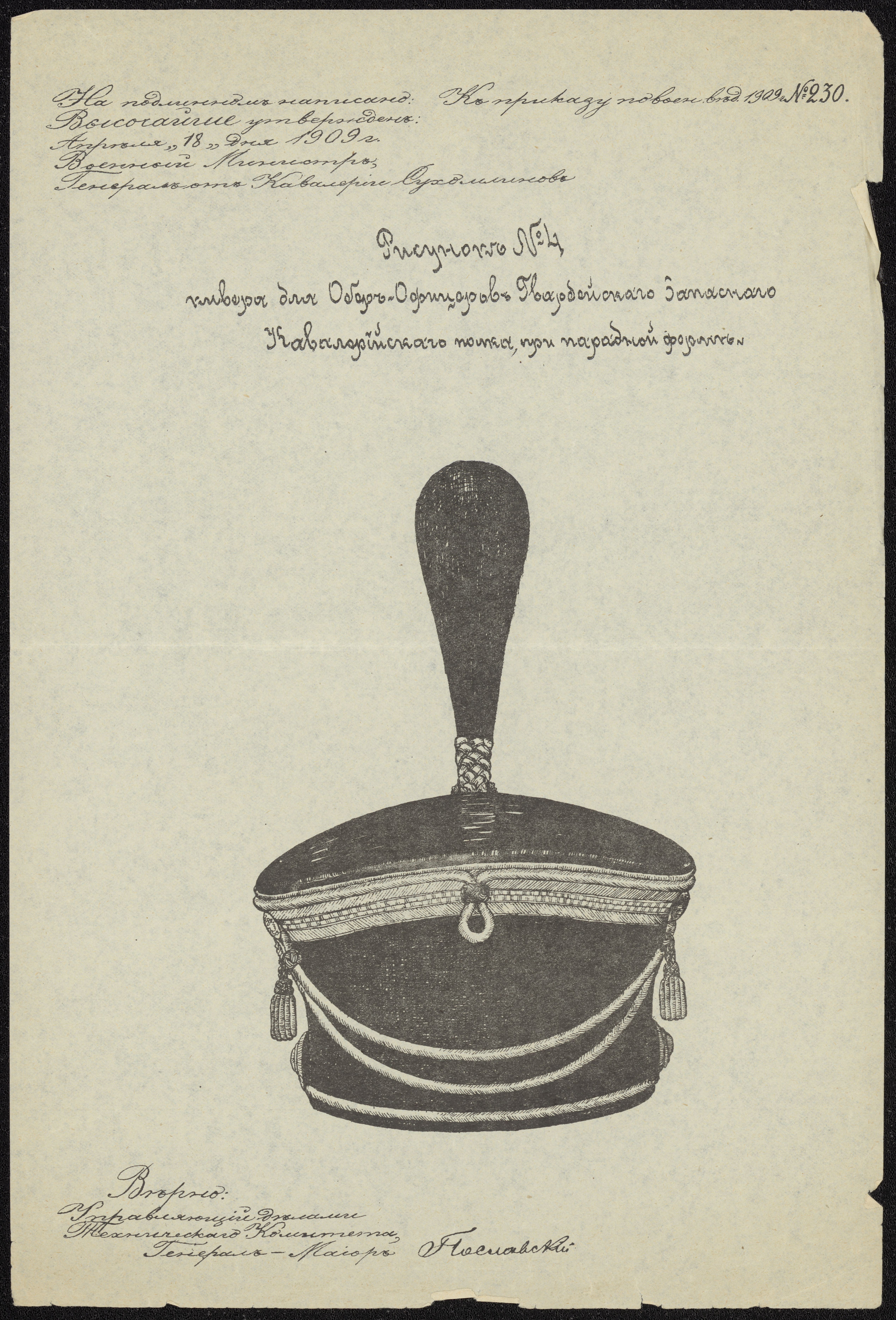 Kopier af approbationstegninger af uniformshatte, 1908-09. Der er tegninger af forskellige typer khiver (kepi'er), czapkaer og papakhaer og deres emblemer og andre detaljer. Fra Gudim-Levkovitj' samling.