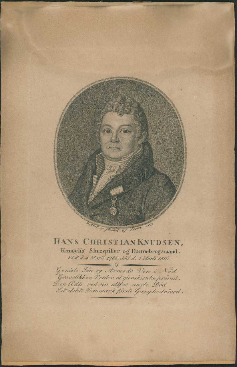 Billede: Portræt af Hans Christian Knudsen. Ansigt og overkrop set forfra. Omfattet af oval. H.C. Knudsen bærer Dannebrogsordenen på brystet. Tekst på billedet: "Hans Christian Knudsen, kongelig skuespiller og Dannebrogsmand. Født den 4. marts 1763, død d. 4. marts 1816. Geniets Søn og Armods Ven i Nød/Gravstikken Verden al gienskienke prøved./ den ædle ved sin altfor aarle Død/ Sit elskte Danmark første gang bedrøvede." Glat mahognlakeret træramme. Indvendigt mål: 19x12 cm. Stik, tegnet og stukket af Senn.