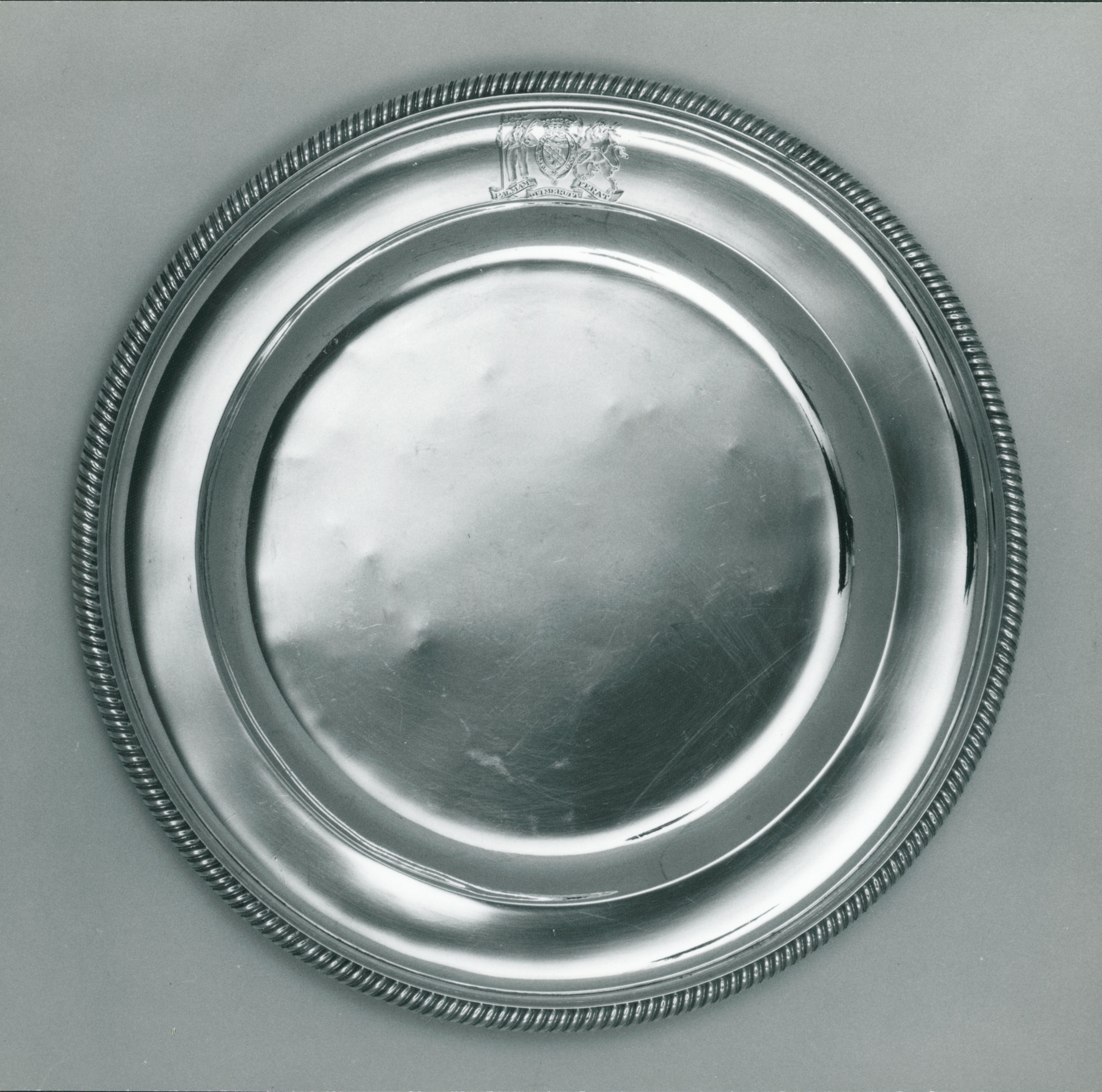Foto: Sølvtallerken med riflet kant og Nelsons våbenforside. Skænket af Lord Nelson.