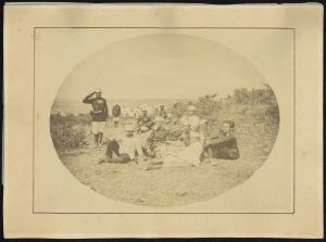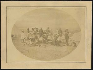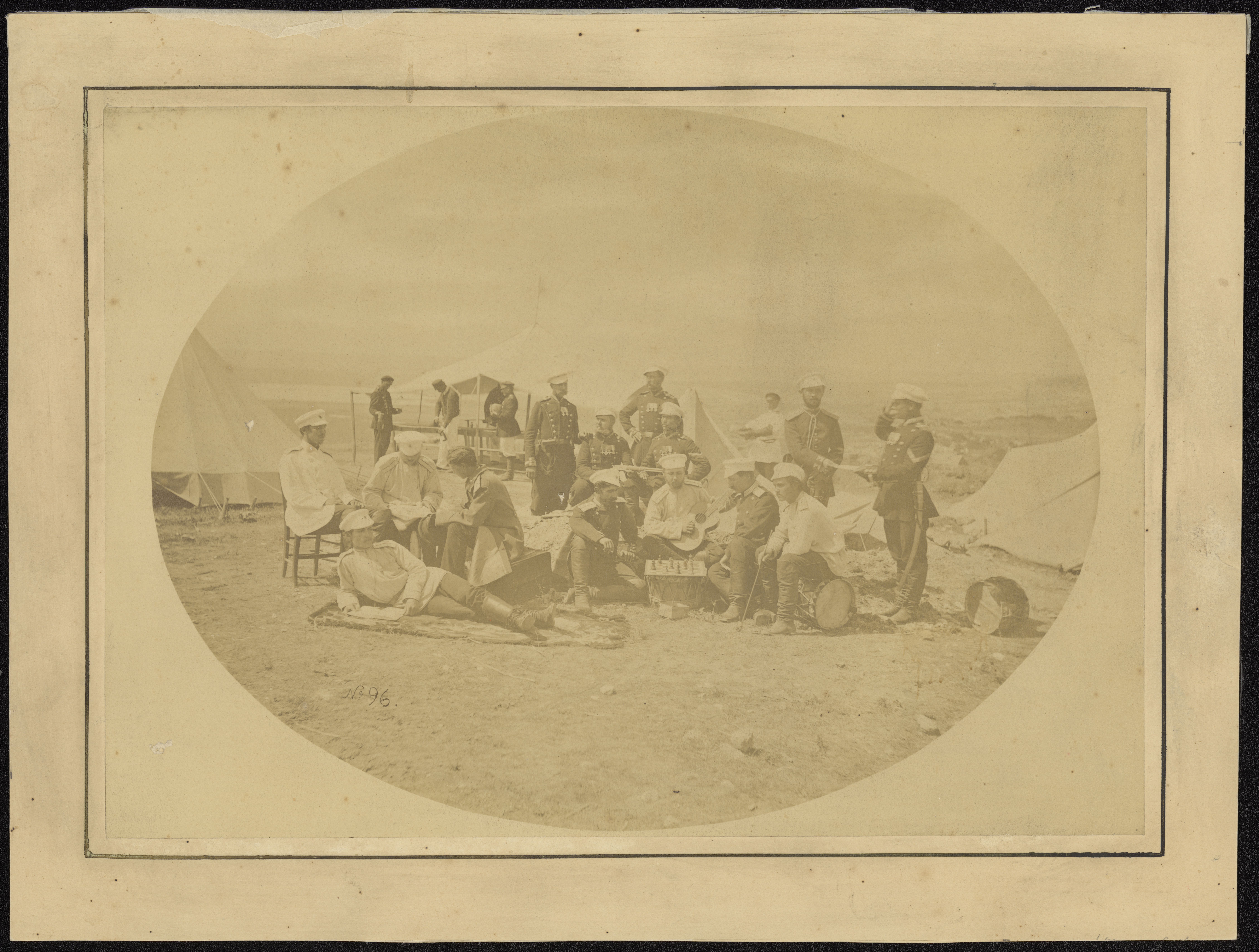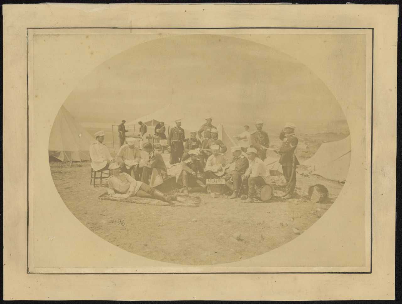 Fotografi af officerer i feltlejr, ca. 1880-90. Det ovale fotografi, som desværre er ret falmet, viser officererne tydeligt poserende i tilsyneladende daglige sysler. To spiller skak, en spiller på guitar. Nogle er fordybet i samtale, nogle læser avis, og en officer modtager en depeche fra en underofficer, der gør honnør.