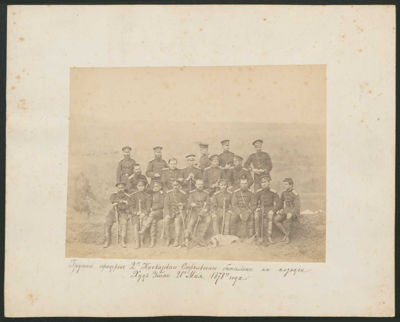 Oversat: "Gruppe af officerer ved 2. Kaukasiske Skytte Bataljons lejr ved Khutsubani, 21. maj 1878". (Kobuleti i Georgien).
