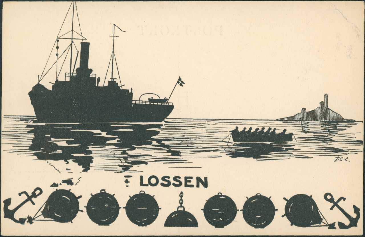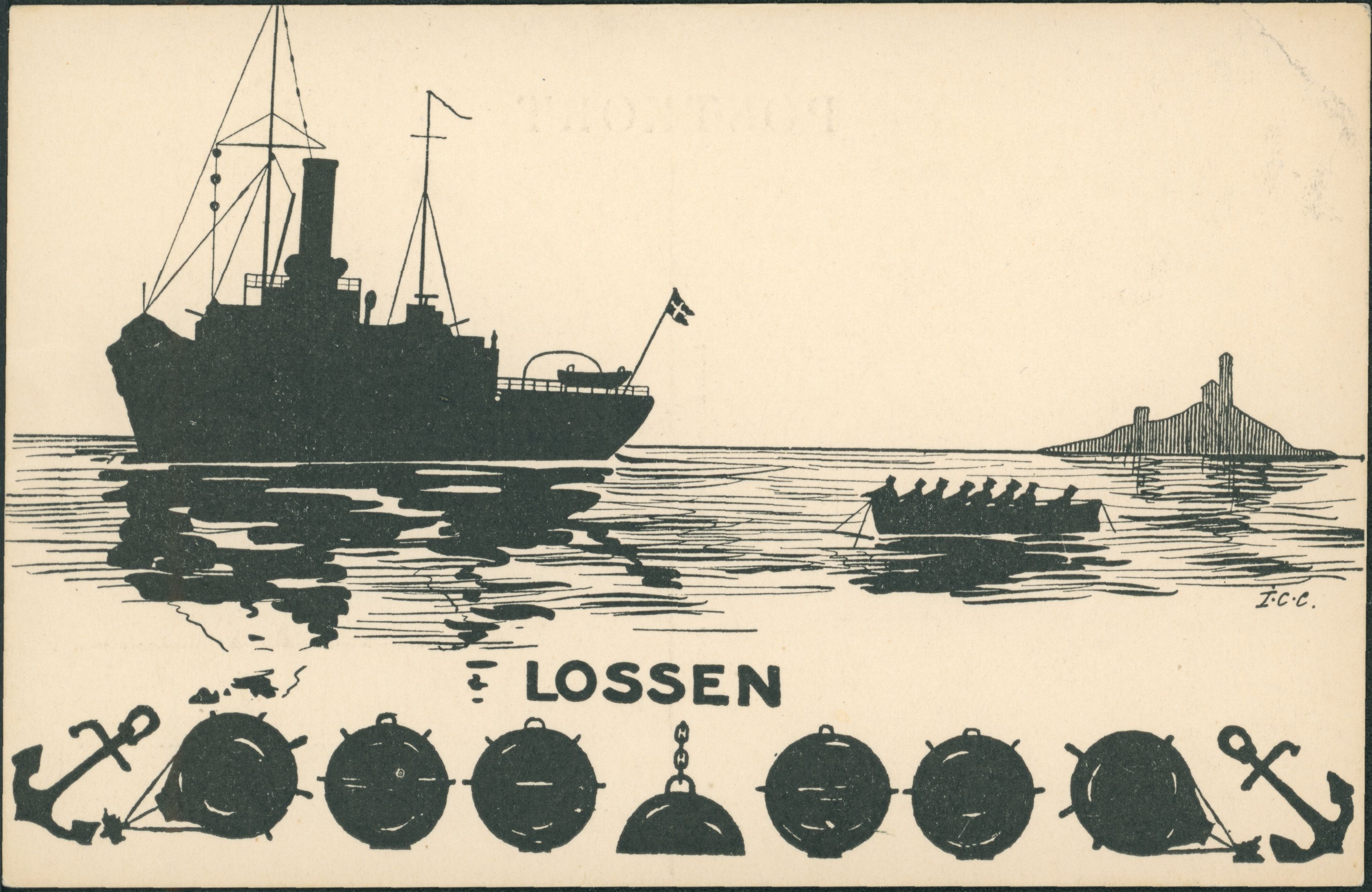 Postkort, 2 stk. "Lossen", set til venstre i billedet mod bagbord. Til højre robåd. Nederst en række miner. Serien: Danske Marine-Silhouetter. Serie I.