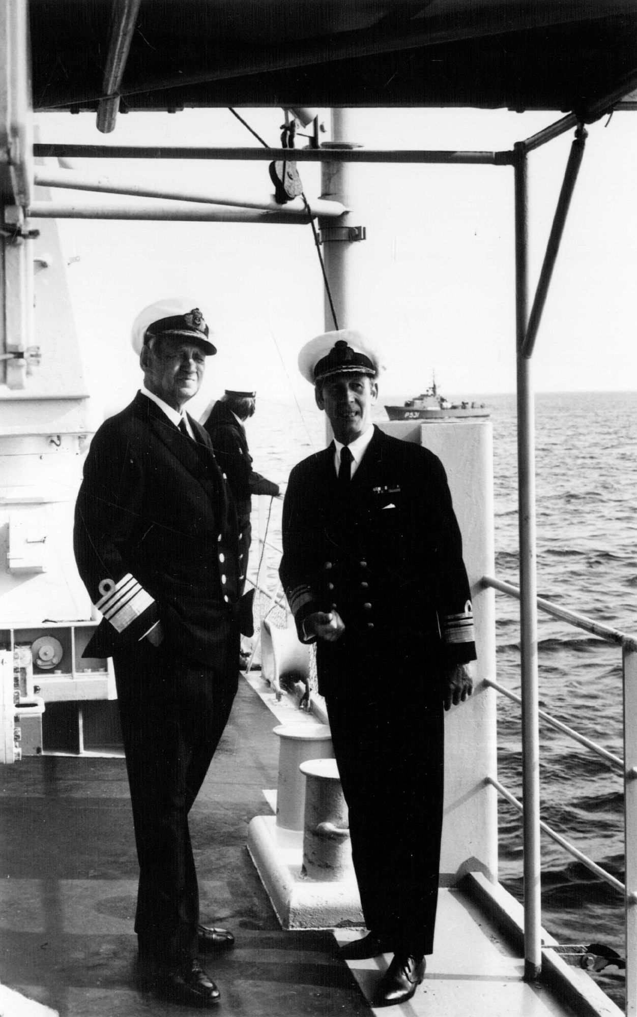 Foto: H.M. Kongen og chefen for søværnet, viceadn. S. Thostrup ombord på minelæggeren "Møn", i anledning af kongens 50 års jubilæum som søofficer, 20. sep. 1971. I baggrunden ses P531, bevogtningsfartøjet "Dryaden".
