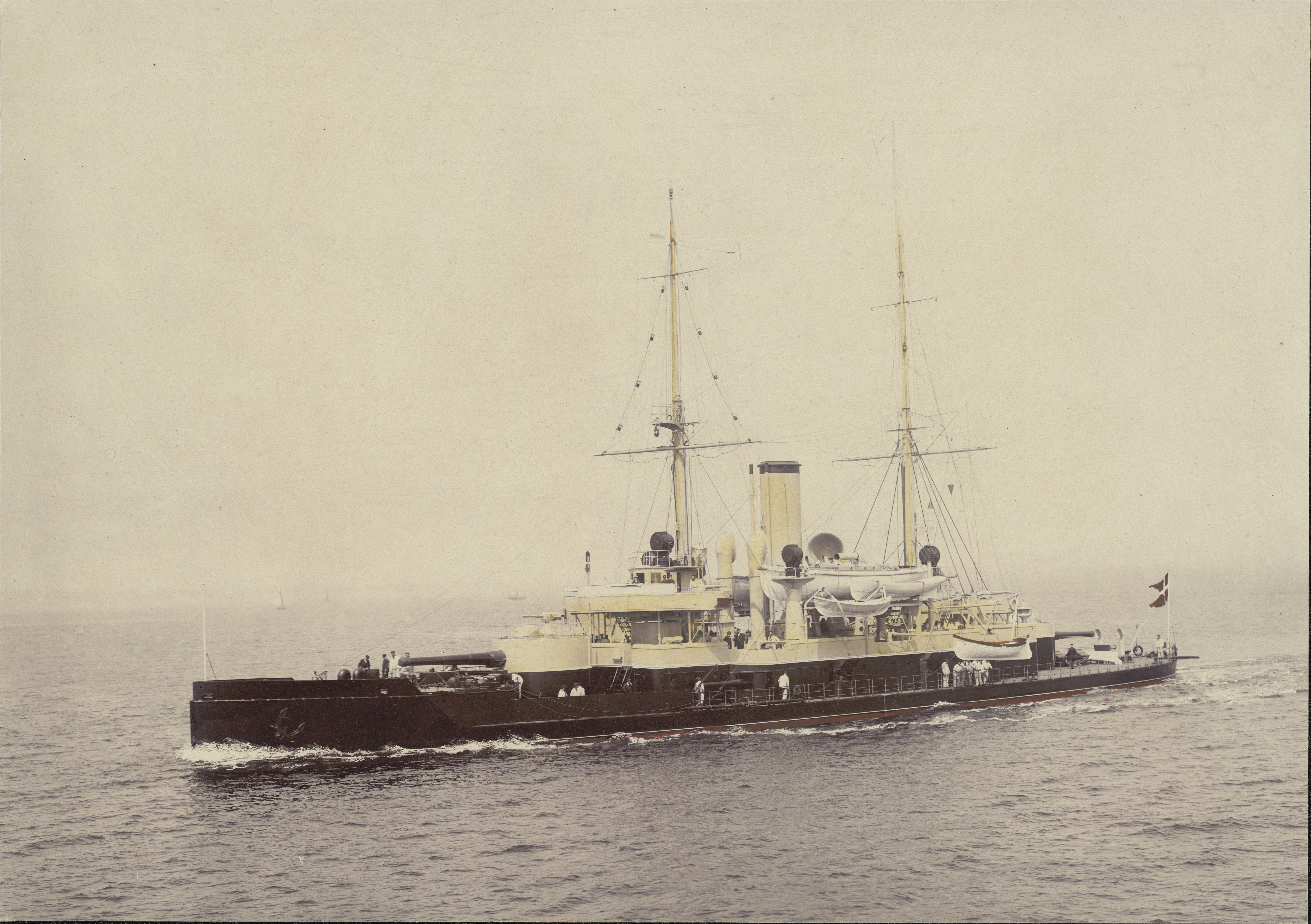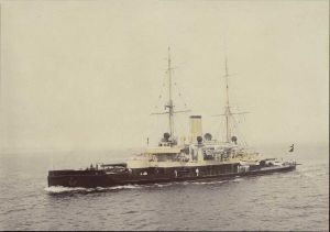 Foto "Olfert Fischer" (1903-1936), foran for tværs mod bagbord. Overbygning og master gulmalede, brovinge, flag og exling på 1 fartøj rødmalede. Text under krone "Panserskibet Olfert Fischer". Brun ramme.