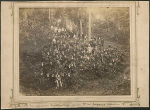 Udendørs gruppefotografi af en stor gruppe bevæbnede mænd i en skov (ca. 60-70 personer). Mændene er for det meste klædt i civil men bærer kasketter med militskors og deres geværer har opplantede bajonetter. Militsen - государственное ополчение - fungerede som en slags hjemmeværn frem til 1917.