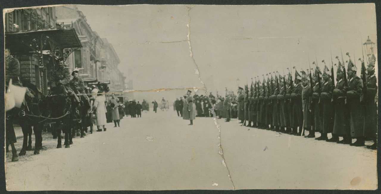 Fotografi fra begravelse, Sankt Petersborg, ca. 1900-1914. Soldater fra Livgarderegiment Pavlovskij står opmarcheret i højre side.