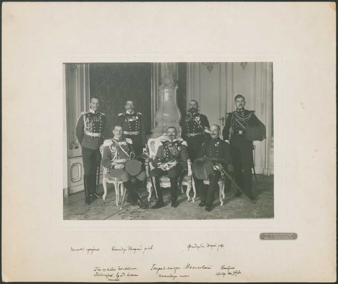 Deputation fra Kexholm-Regimentet i Wien iiflg. tekst på foto i anledning af Kejser Frantz Josephs 50 års regeringsjubilæum (1898). Det kan dog ikke passe, idet Pototskij - Потоццкий, Сергей Николаевиц - som sidder forrest til venstre, er oberst, hvilket han først blev i 1909.