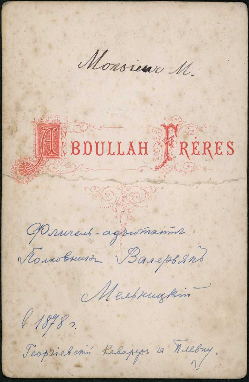 Russisk tekst på bagside: "Флигель-адъютант полковник Валерьян Мельницкий 1878 год Георгиевский кавалер за Плевну"