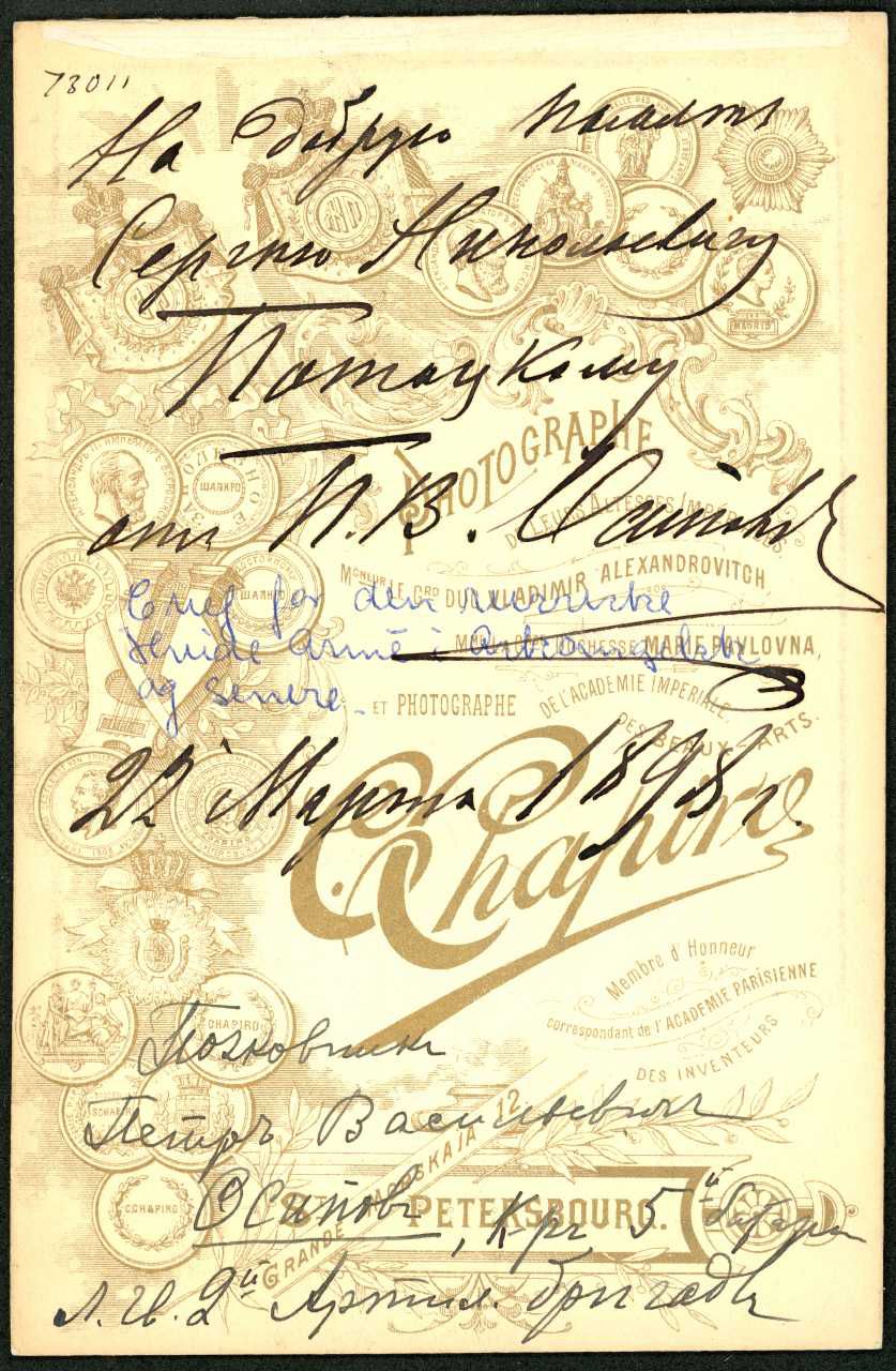 Fotografisk portræt af oberst P.V. Osipov, 1898, bagside