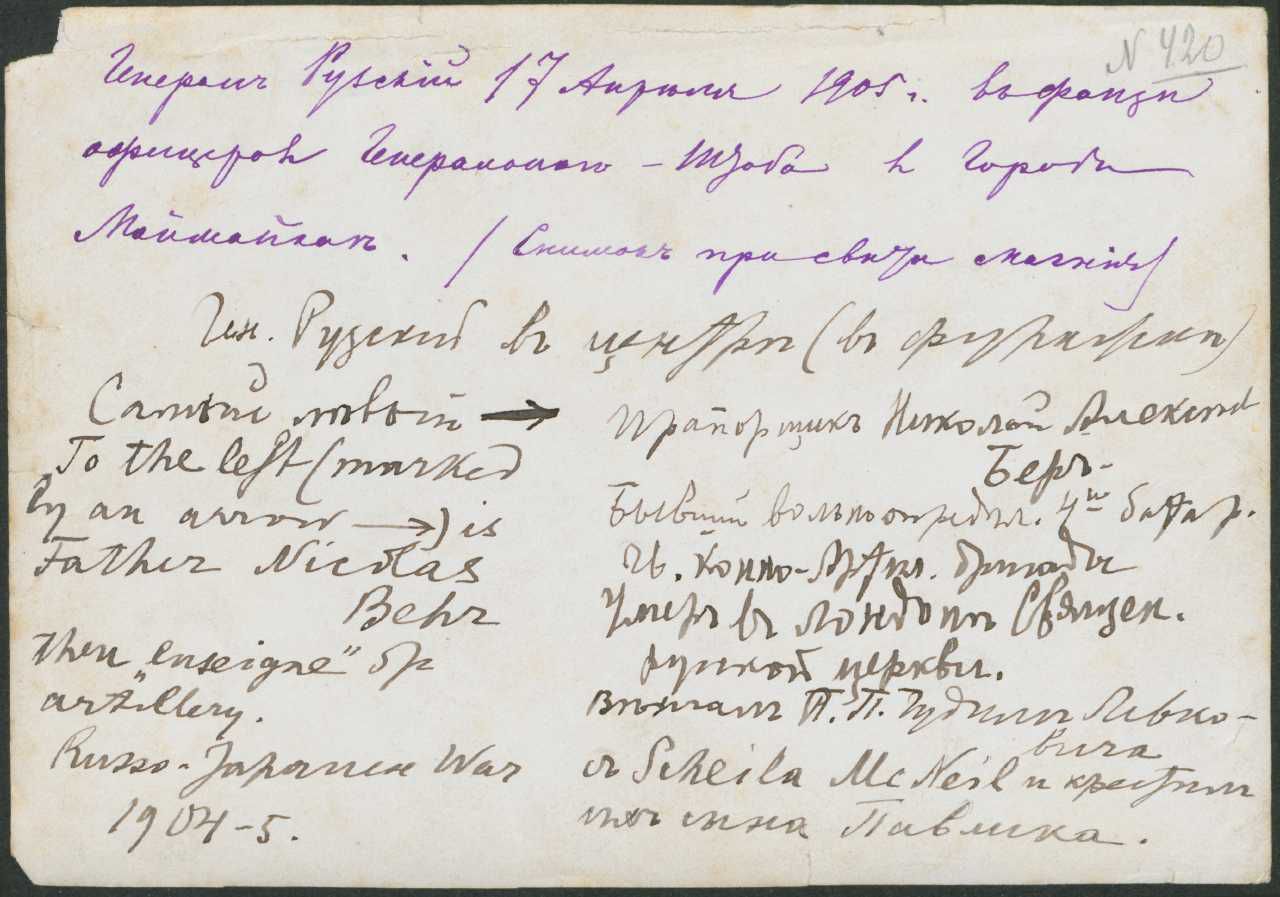Fotografi af 2. Armés stab i deres hovedkvarter i Manchuriet, 17. april 1905. På billedet se et par identificerede personer, dels general Rutskij - Никола́й Влади́мирович Ру́зский (1854-1918) dels løjtnant Nikolaj Ber - Николай Алексеевич Бер (1879-1940). Ber var præst i London og viede general Paul-Gudim Levkovitj' søn, Paul med Sheila McNeil i oktober 1936. På billedet ses også oppe i venstre side en taske med påskriften " Полковник Добровольский Штаба 2й Армии" - "Oberst Dobrovolskij, 2. Armés Stab", formentlig oberst Sergej Konstantinovitj Dobrovolskij - Сергей Константинович Добровольский (1867-1930).