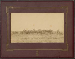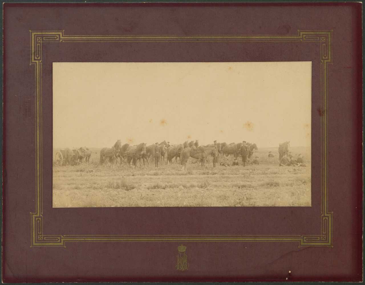 Fotografi af hesteforspand og soldater der holder hvil i felten, ca. 1880