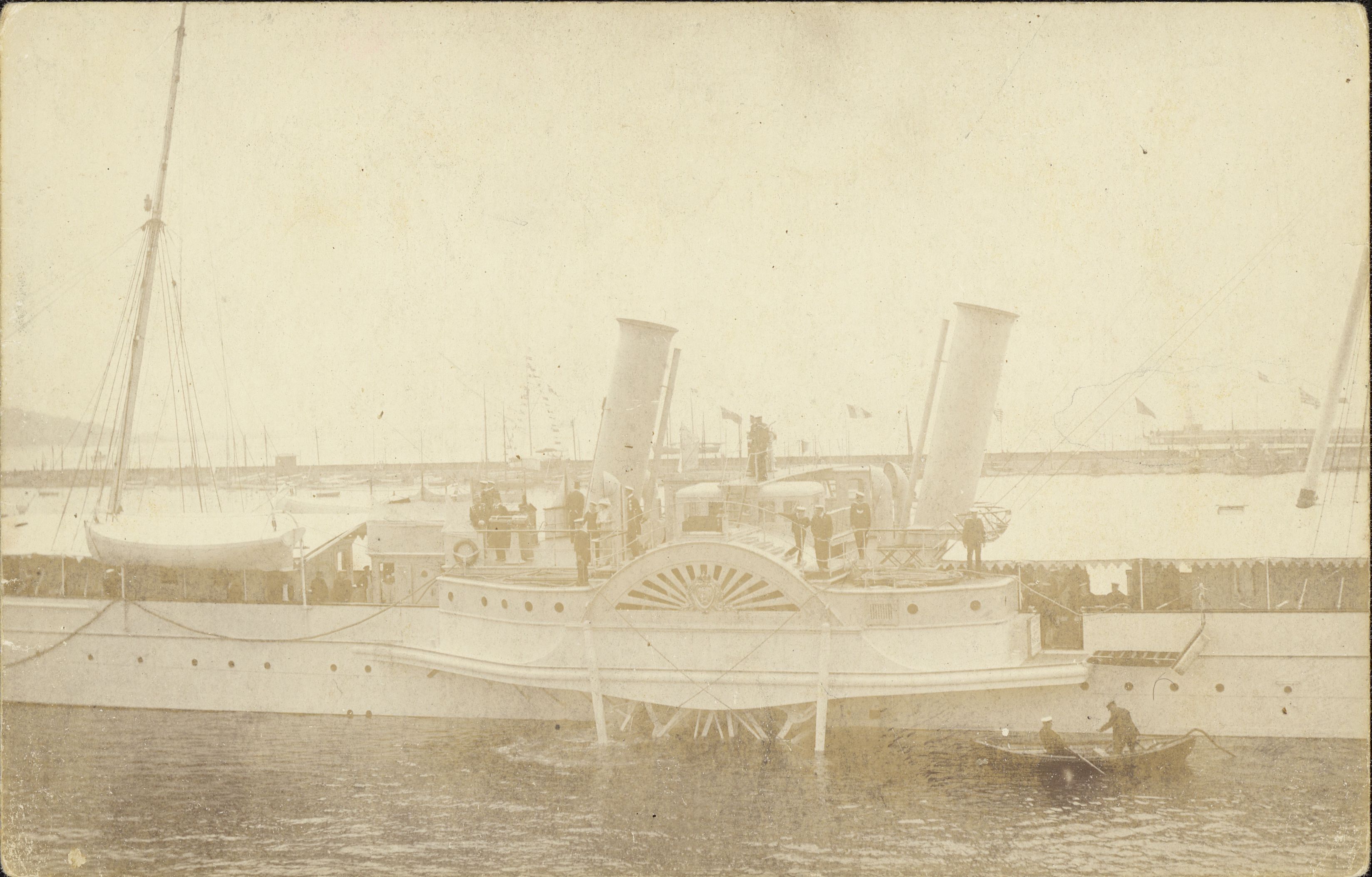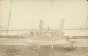 Postkort visende Dannebrog (1880-1931) set mod bagbord. Detalje med bagbords skovlhjul.