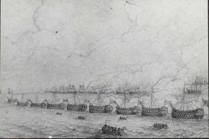 Foto af tegning (blyant) visende 8 blokskibe på linie og i baggrunden den engelske flåde i sundet 1801.
