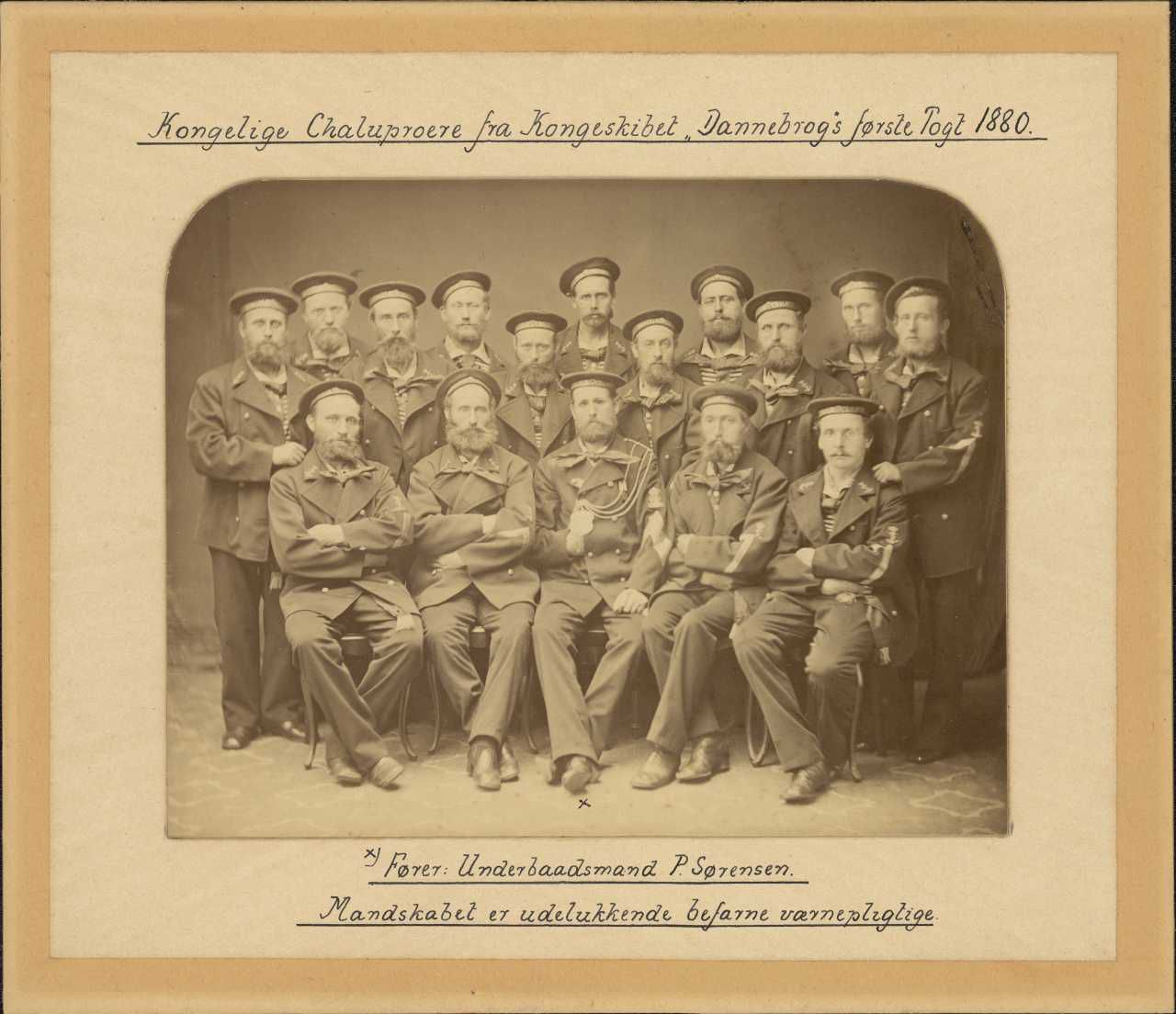 Foto s/h: Kgl. Chaluproere fra kongeskibet "Dannebrog"s første togt 1880. I sort ramme med indvendig forgyldt kant. Fotoet er givet af enken til underbådsmanden P. Sørensen i 1923. Foto MR: 1102 - 1970.
