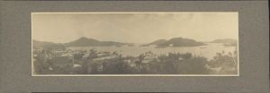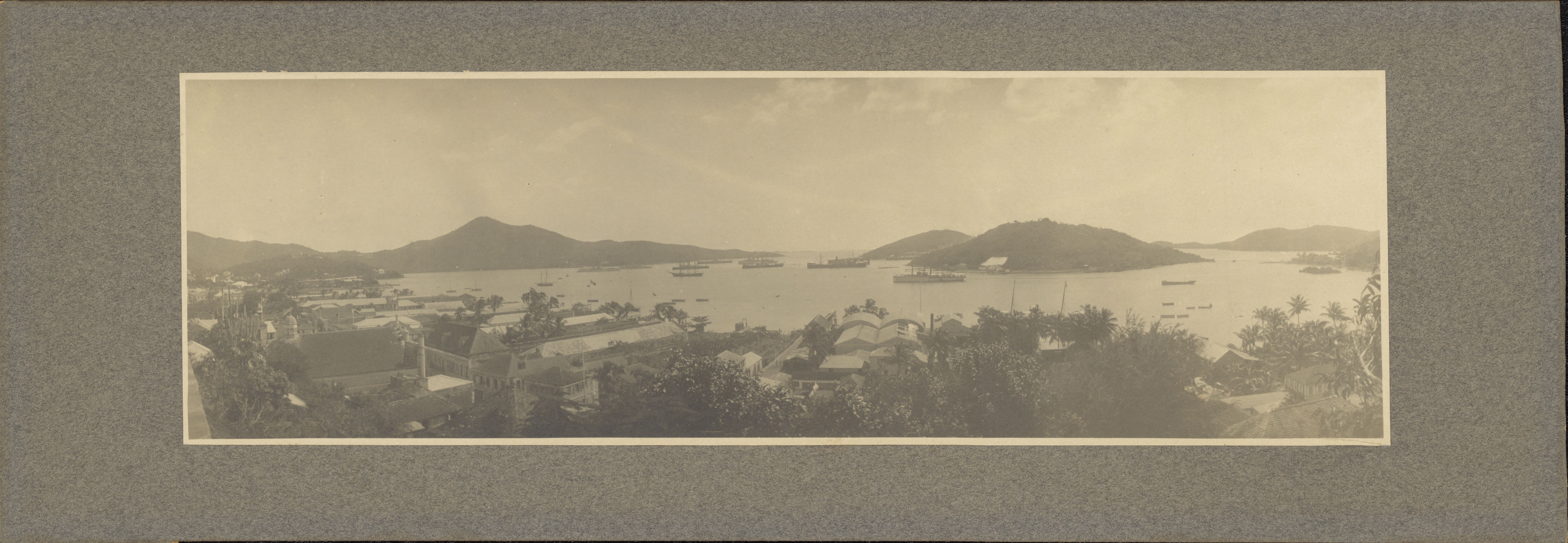 Foto s/h af bugten ud for Charlotte Amalie med opankrede skibe. 2 cm bred brunlakeret træramme 16x40 cm.