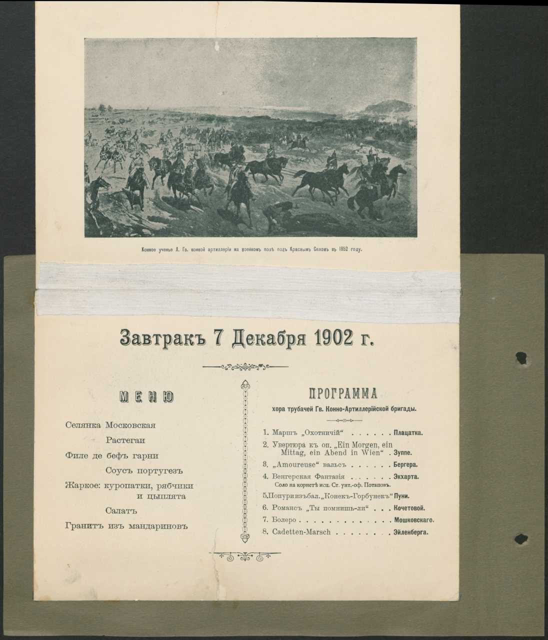 Album med billeder og udklip vedr. Hestgardeartilleriet - Лейб-гвардии Конная артиллерия. Menu og program for en morgenmad 7. december 1902.