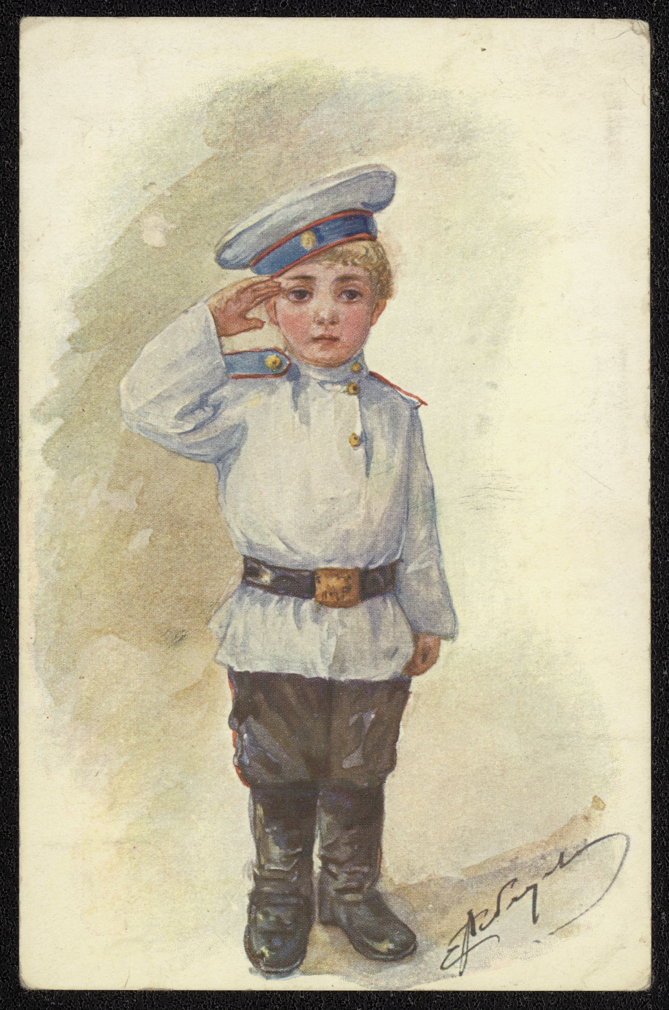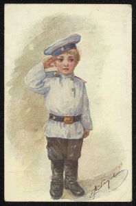 Russisk Røde Kors-postkort med billede af en dreng i hvid uniform, 1914. På bagsiden en hilsen fra Paul Gudim-Levkovitj til datteren Kira.