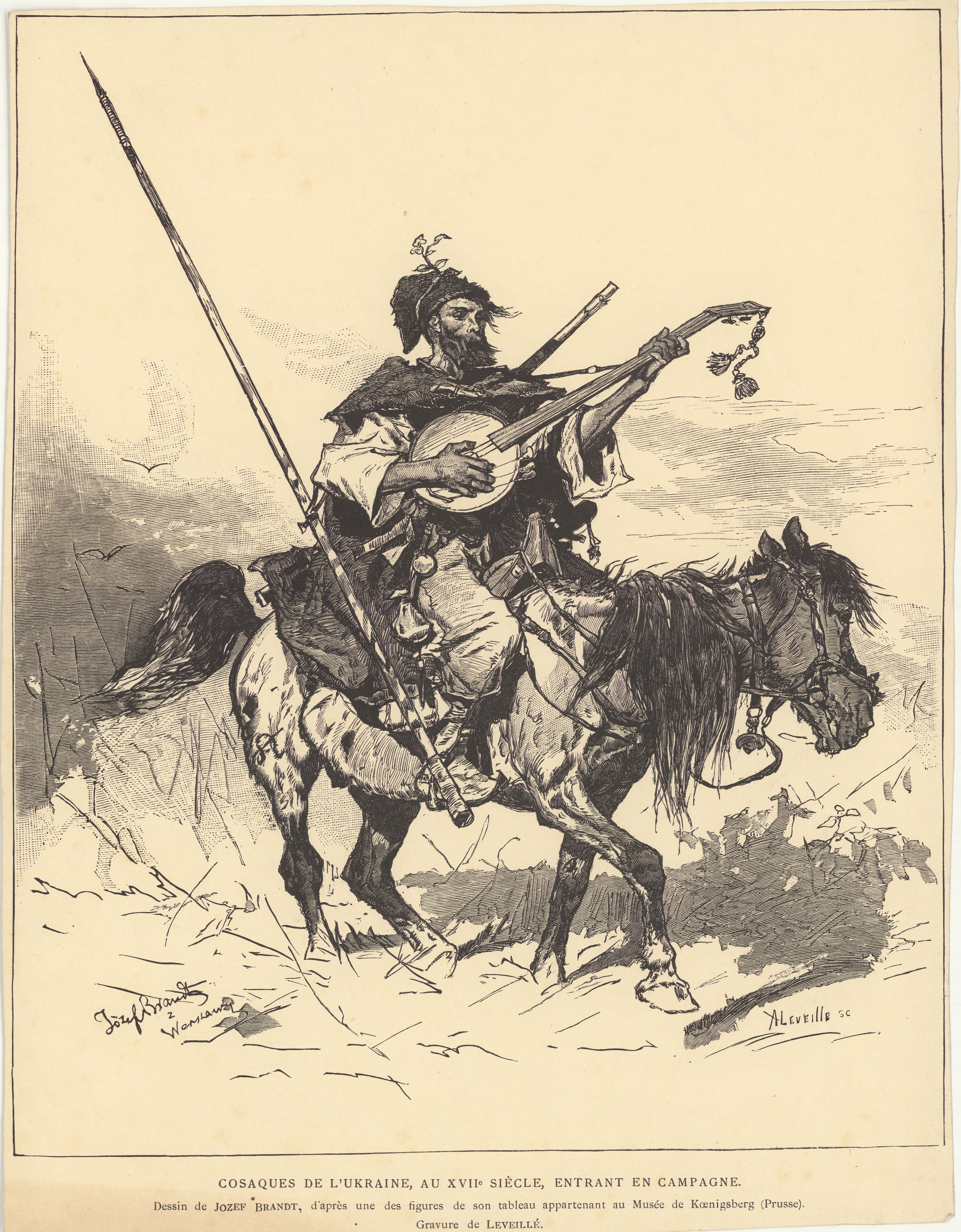 Ukrainsk kosak til hest, spiller guitar. Diverse grafik vedr. russisk militærhistorie og uniformer, 1800-tallet. Fra Gudim-Levkovitj' Samling.