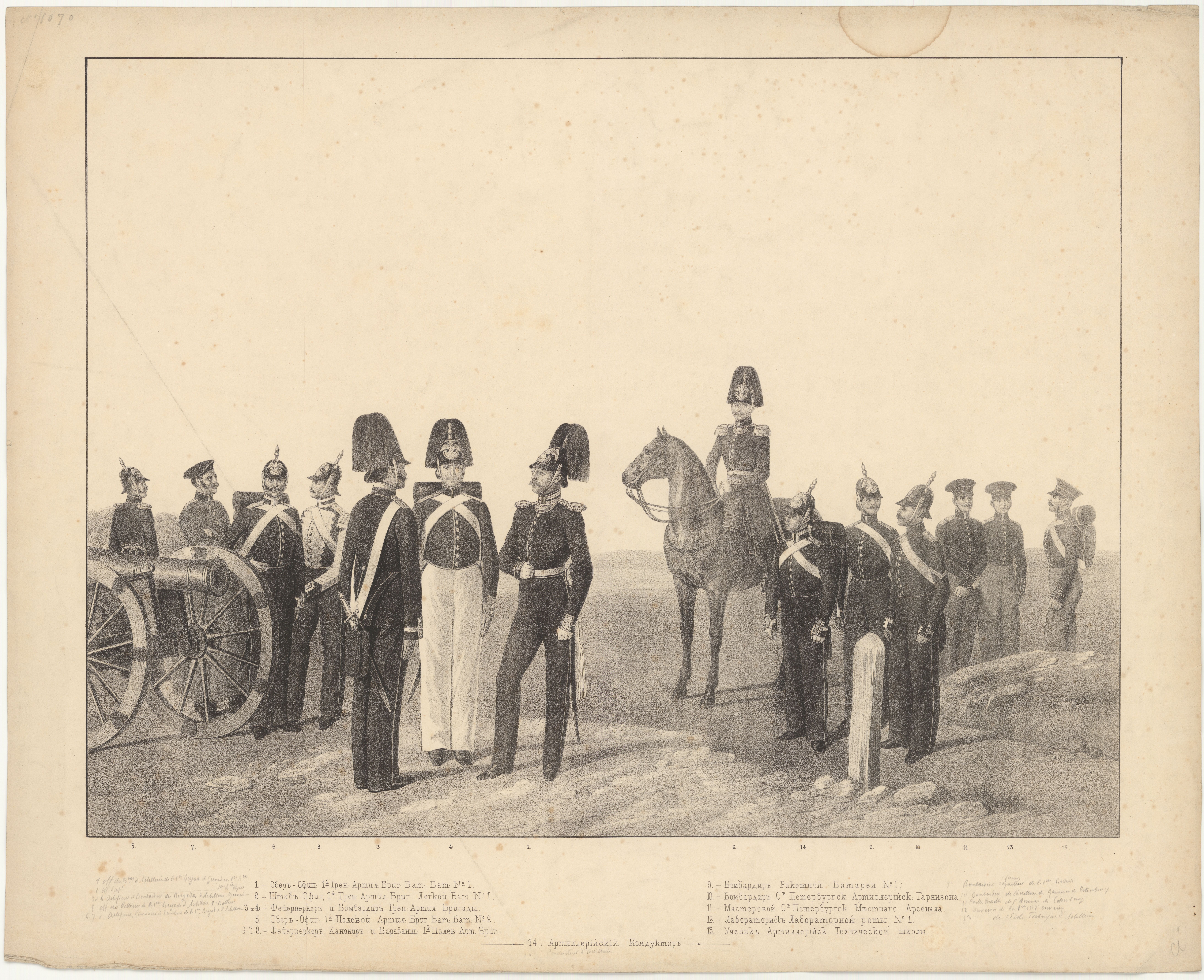 Diverse grafik vedr. russisk militærhistorie og uniformer, 1800-tallet. Fra Gudim-Levkovitj' Samling.Uniformsplancher tegnet af kunstneren Karl Karlovitj Piratskij - Пиратский, Карл Карлович (1813-1871).