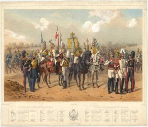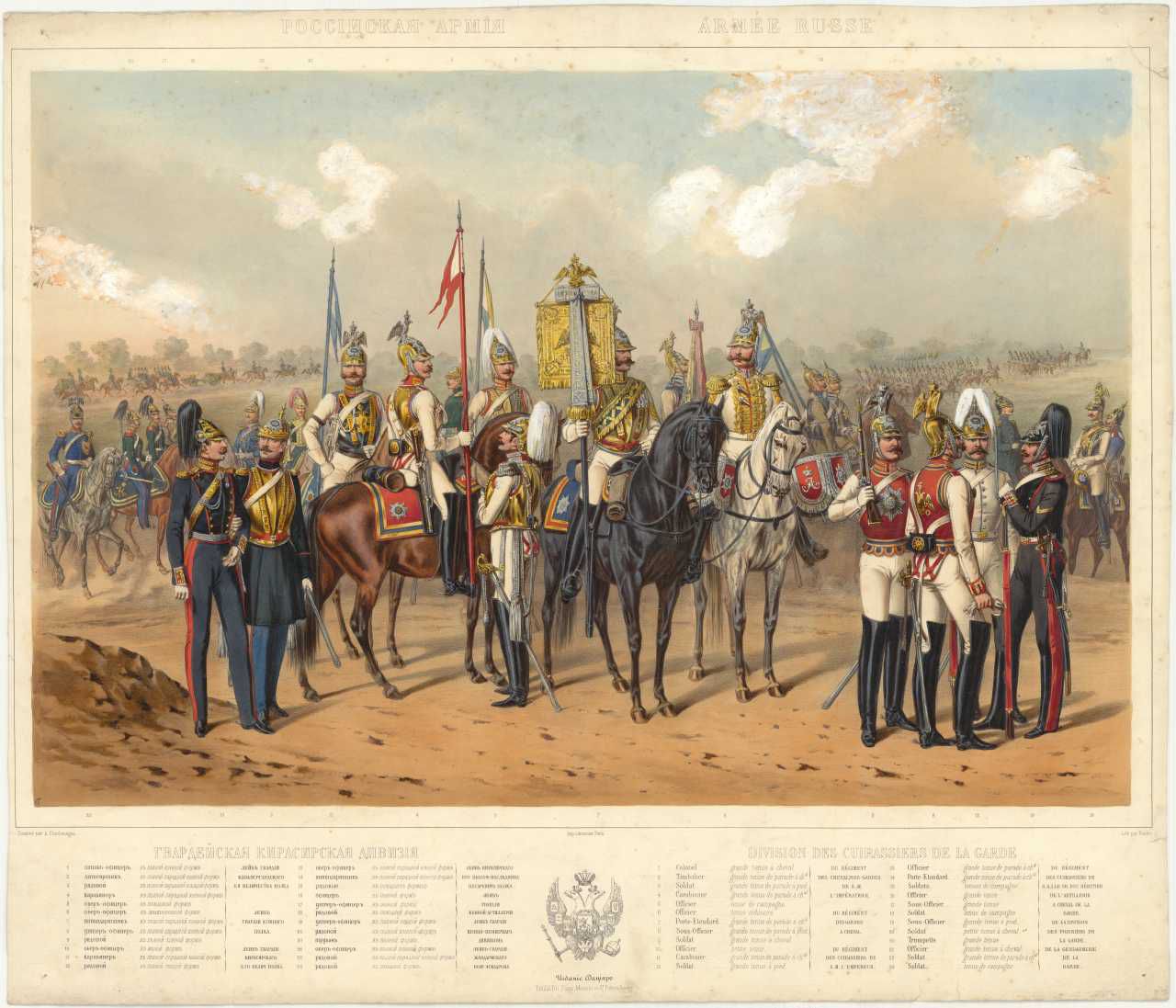 Diverse grafik vedr. russisk militærhistorie og uniformer, 1800-tallet. Uniformsplanche tegnet af kunstneren Adolf Josifovitj Charlemagne - Адо́льф Ио́сифович Шарлема́нь (1826-1901).