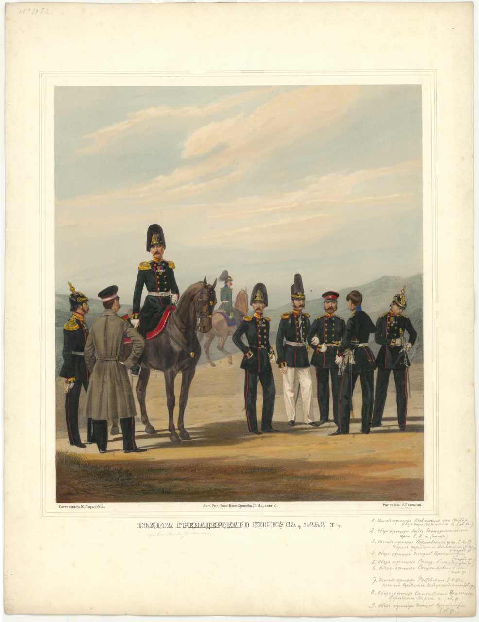 Fra Gudim-Levkovitj' Samling.Uniformsplancher tegnet af kunstneren Karl Karlovitj Piratskij - Пиратский, Карл Карлович (1813-1871).