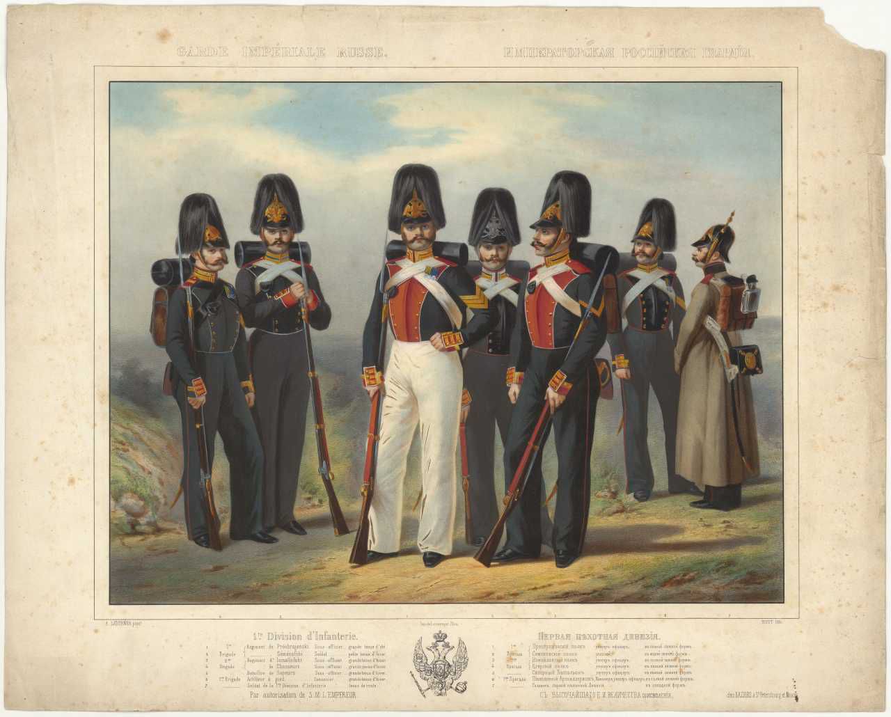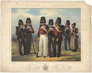Diverse grafik vedr. russisk militærhistorie og uniformer, 1800-tallet. Uniformsplanche tegnet af kunstneren Wilhelm-Adolf Ladurner - Адольф Игнатьевич Ладюрнер (1799—1855).