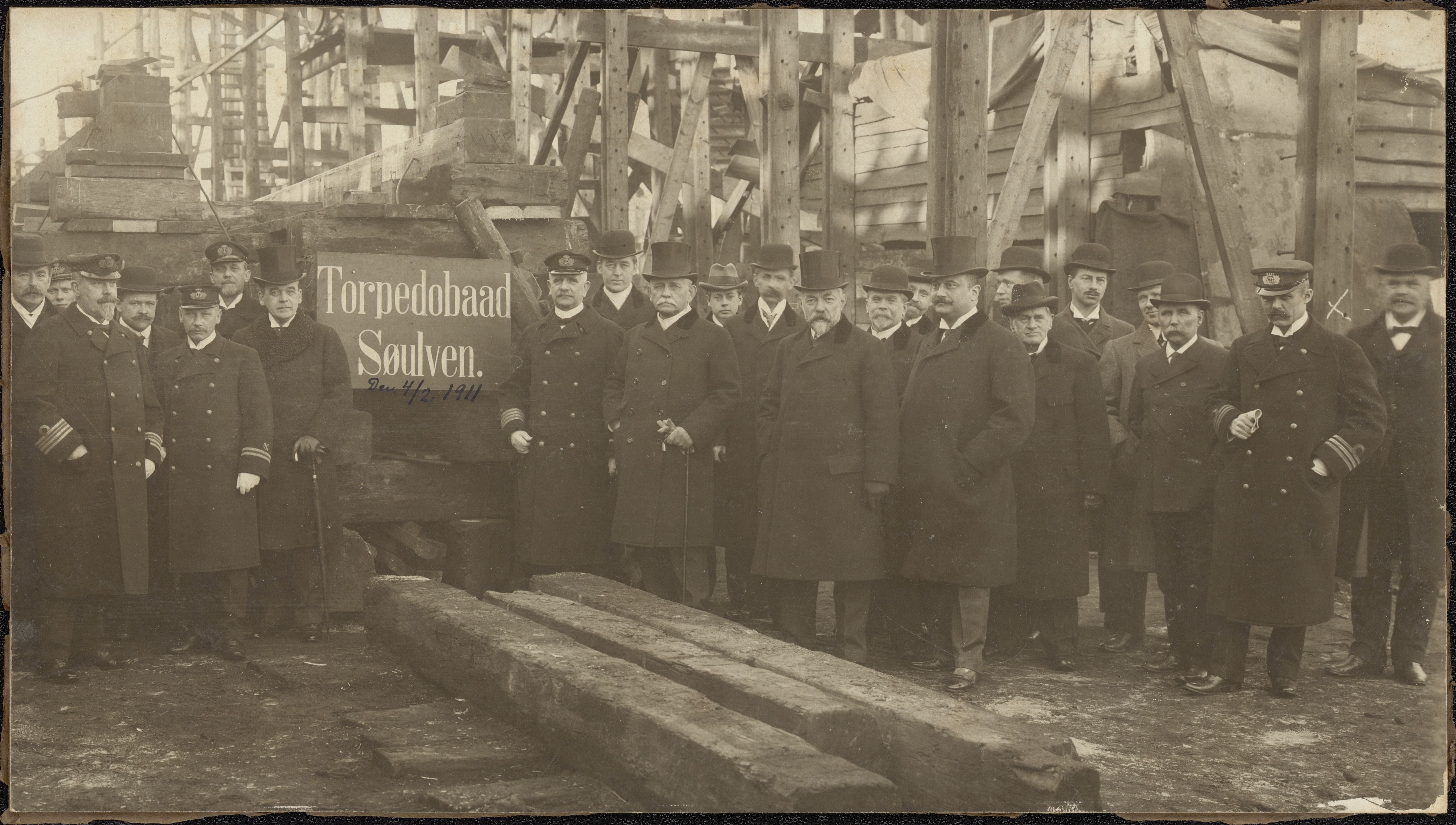 Foto, gruppebillede, fra 1911 med officerer og stadsklædte civile i forbindelse med søsætningen af "Søulven" i 1911 på Orlogsværftet.