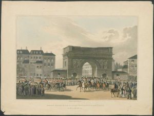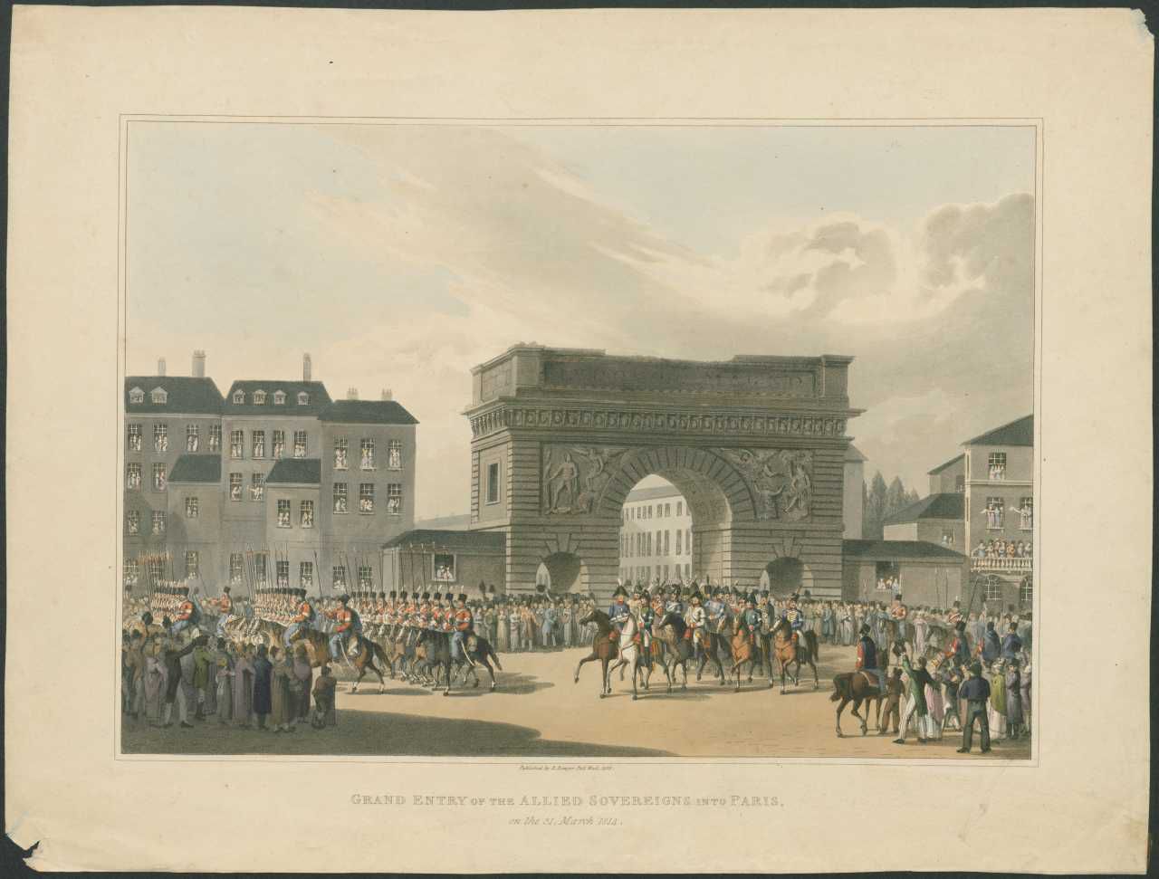Litografi, indtoget til Paris, 1813. Koloreret stik visende de allieredes indtog i Paris i 1813 "Grand entry of the allied Sovereigns into Paris".