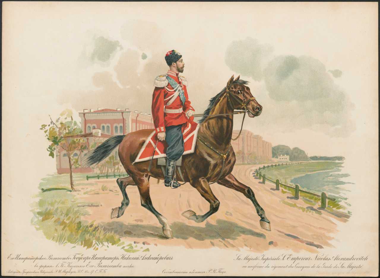 Kejseren til hest iført uniform for det Kejserlige Kosak-Livgarde-Regiment.