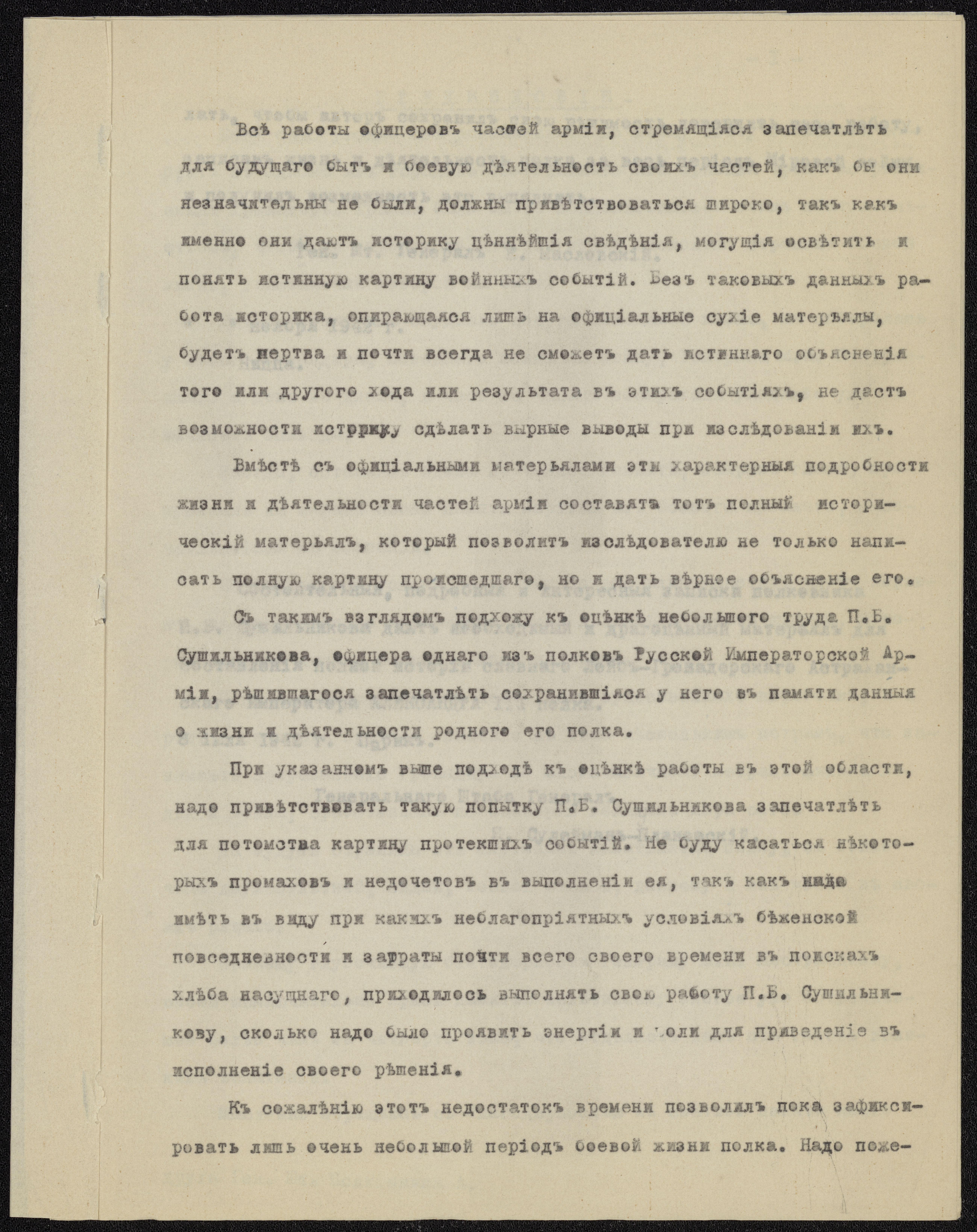 Maskinskrevet manuskript om Astrakhan-Grenaderer, Nice, 1942. Russisk titel: "П.Б. Сушилников: Aстраханские гренадери" Fra Gudim-Levkovitj' Samling.