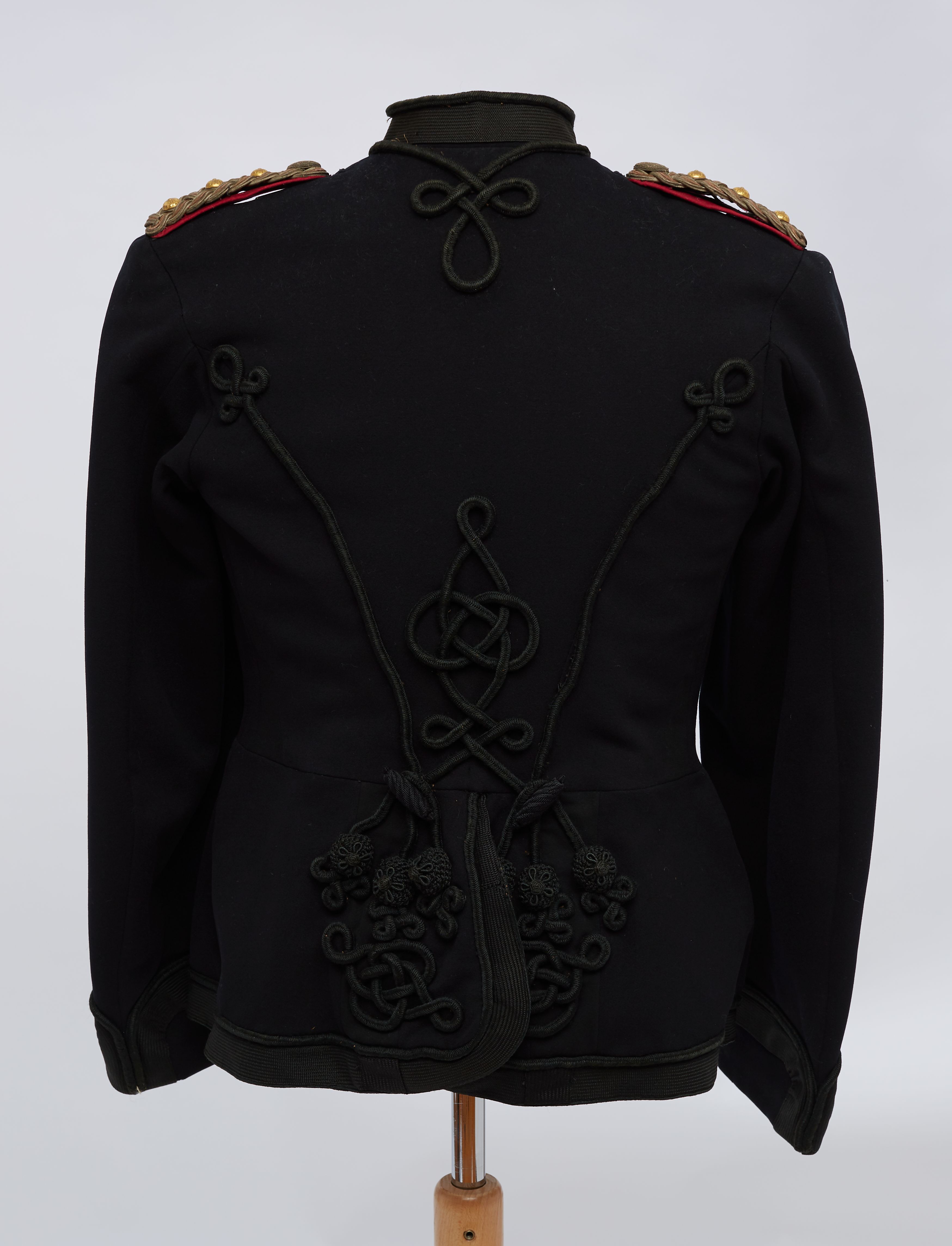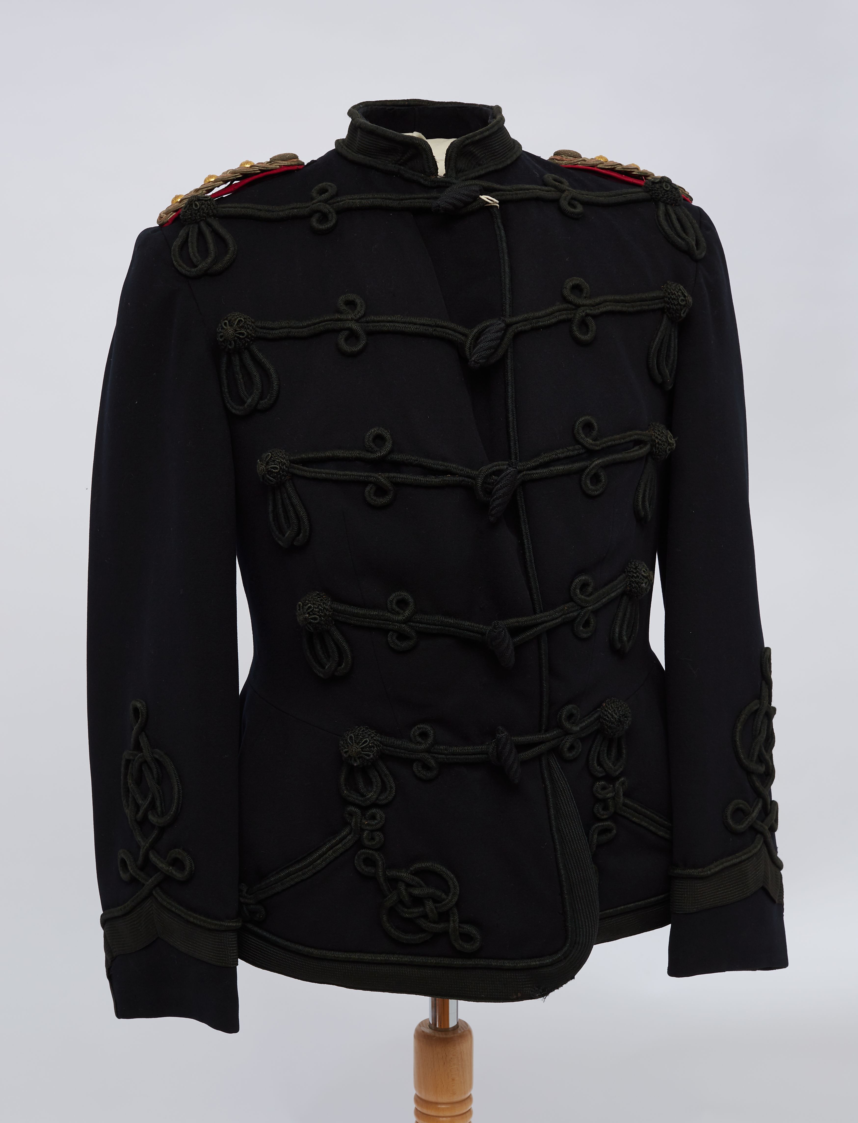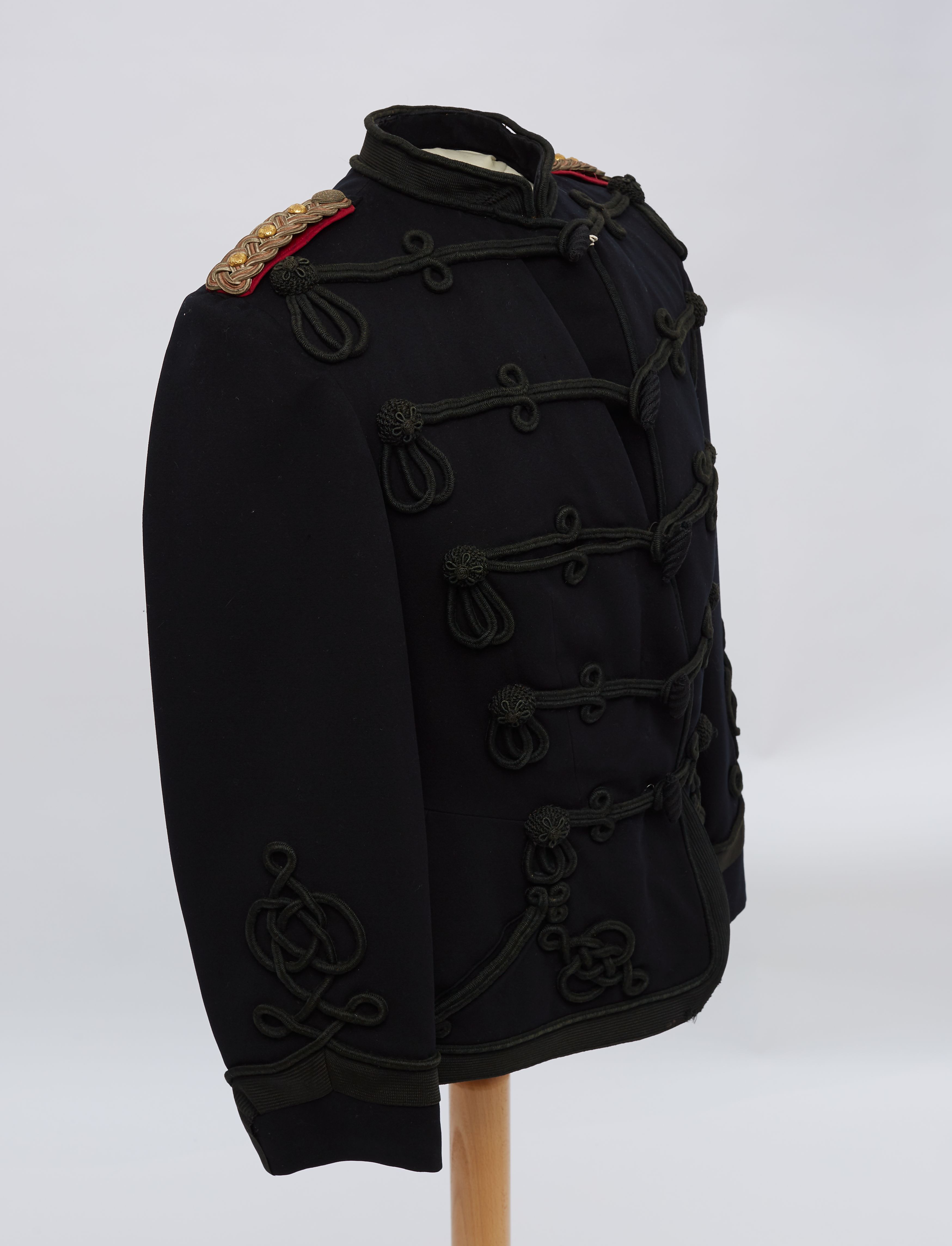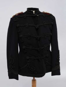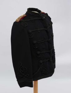 "Snorefrakke for kaptajn af Gardehusarregimentet, ca. 1890. \n\nMørkeblå/sort, med sorte mohairbånd langs krave, forkant og ærmeopslag. Tykke sorte uldsnore i ungarske knuder pryder ærmerne og bagpå. De samme snore er lagt i 2x5 sløjfer forpå. Ovenpå sløjferne er en stor og høj possementknap. Fem aflange possementmagerknapper for. Lav opstående krave med kantning af uldsnor. \nFlettede skuldergradstegn fra før M/1889 af sølvsnor med tre rosetter af gult metal, og en rund sølvsnorknap. En rød silkesnor i den flettede sølvsnor. Distinktionen viser kaptajn i Gardehusarregimentet. I museets samlinger findes en lignende i Christian 10.s uniformer."