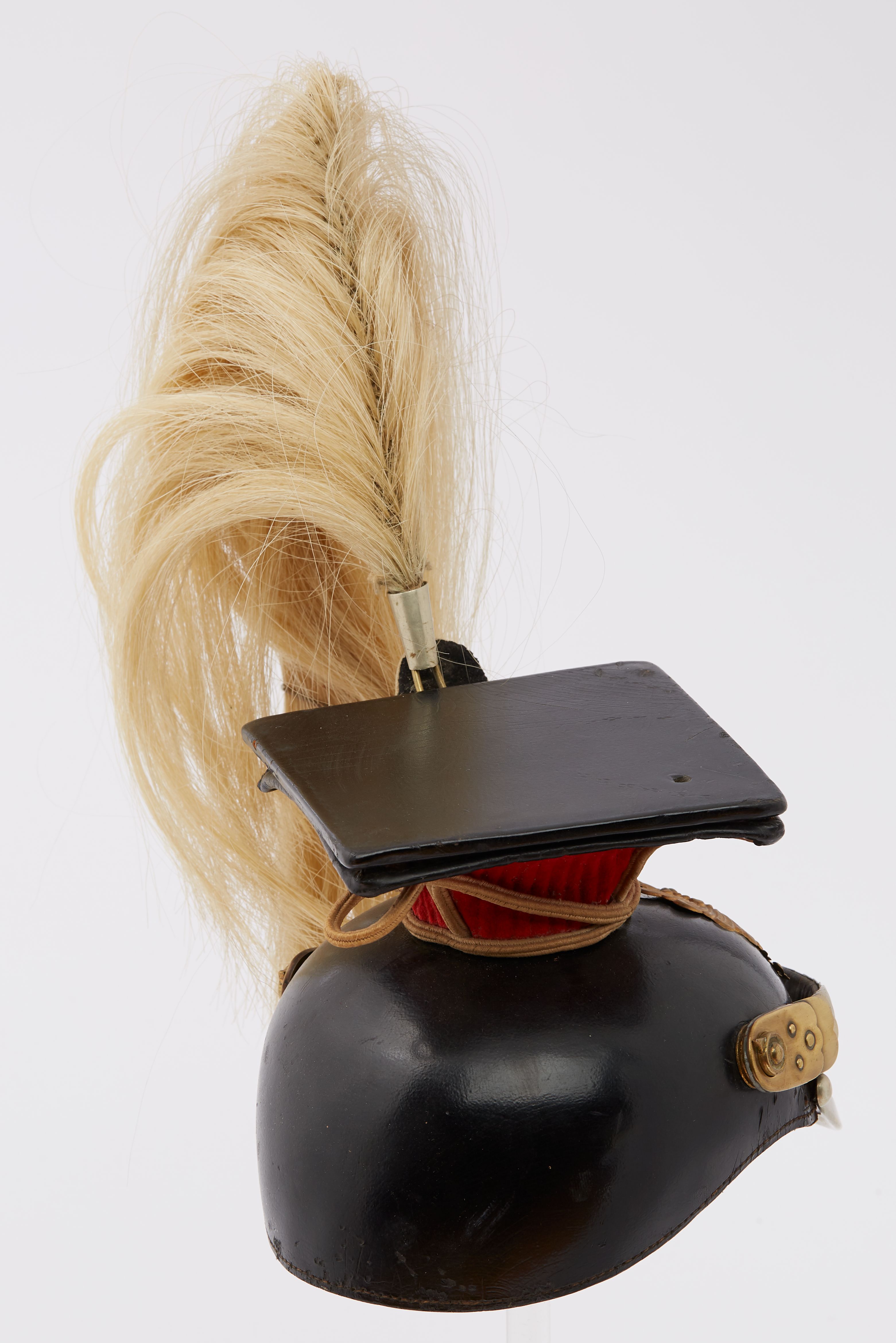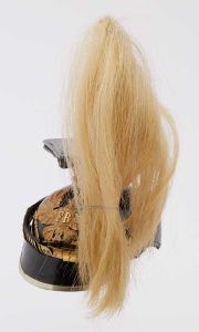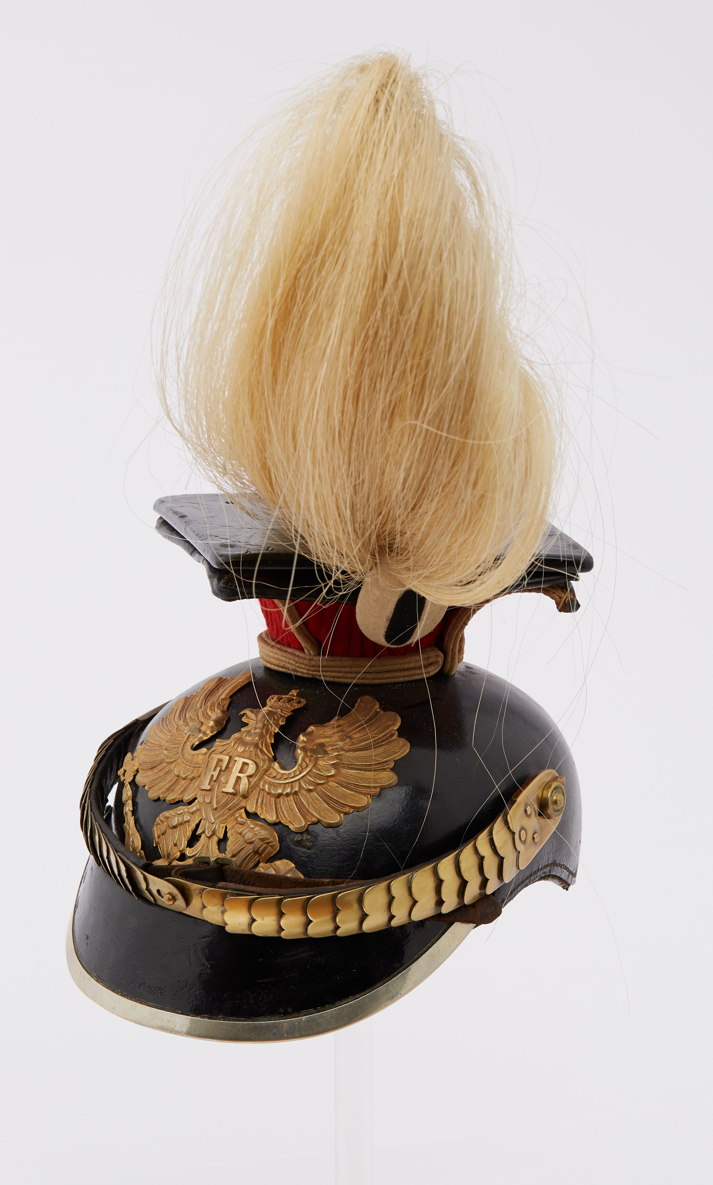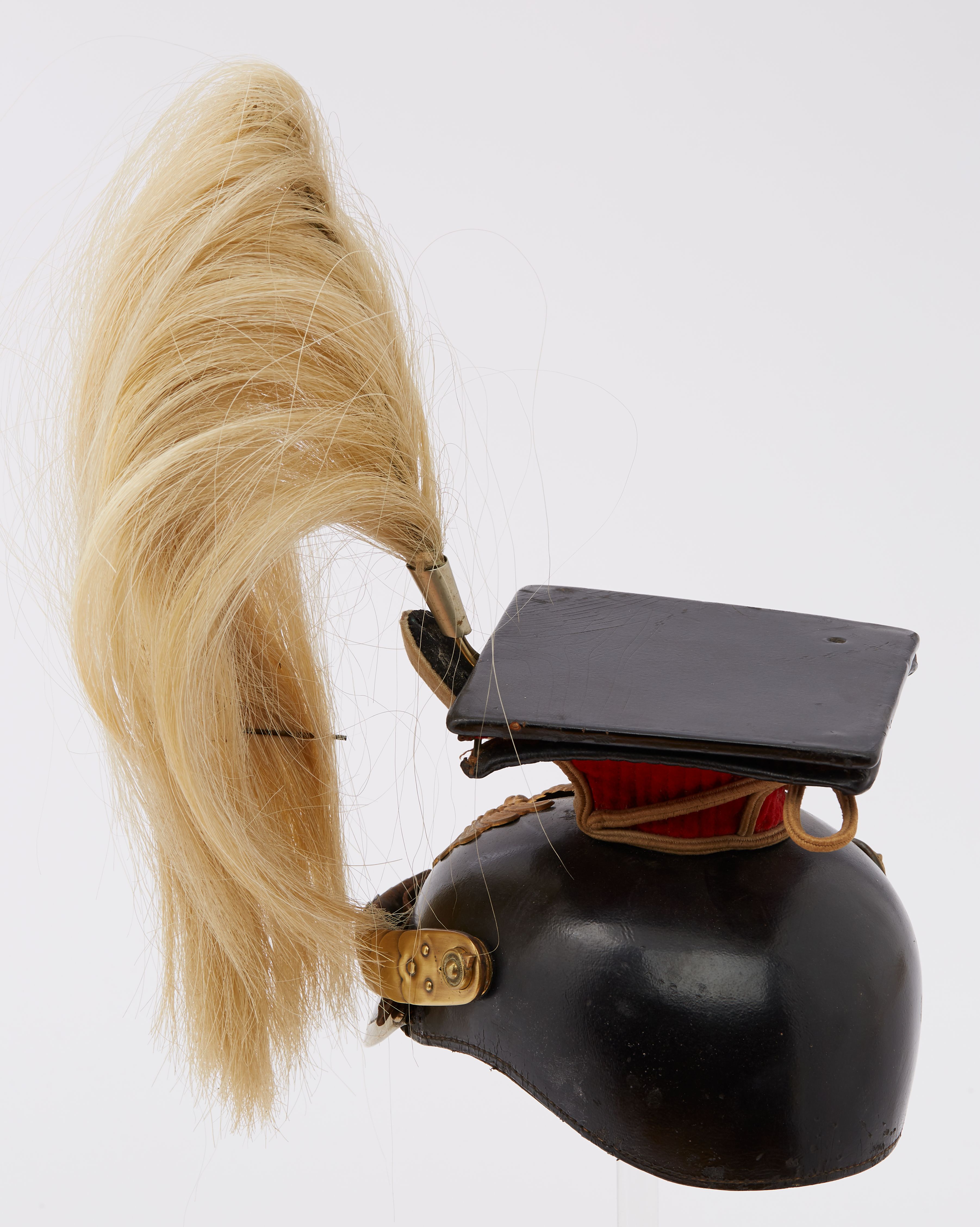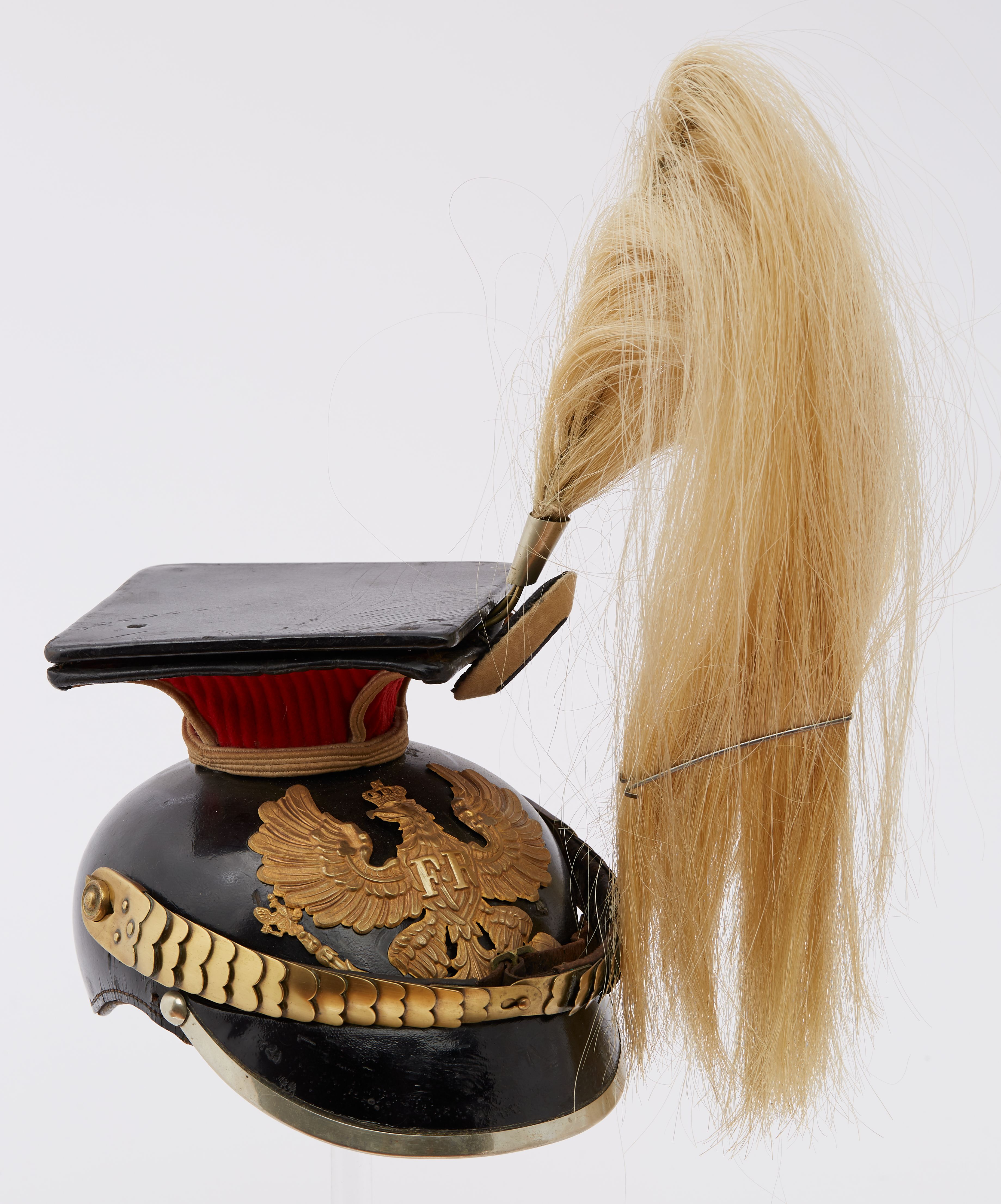 "Czapka, tysk 1914-18.\nSortlakeret læder, med hvid metalkant på forskygge, fortil ørn med scepter og rigsæble i gult metal. Ørmen har \"FR\" på brystet. Med hvid hestehårssvejf og oval hvid og sort klædeskokarde på venstre side. Underdelen af den firkantede puld er beklædt med riflet rødt klæde og hvide snore"