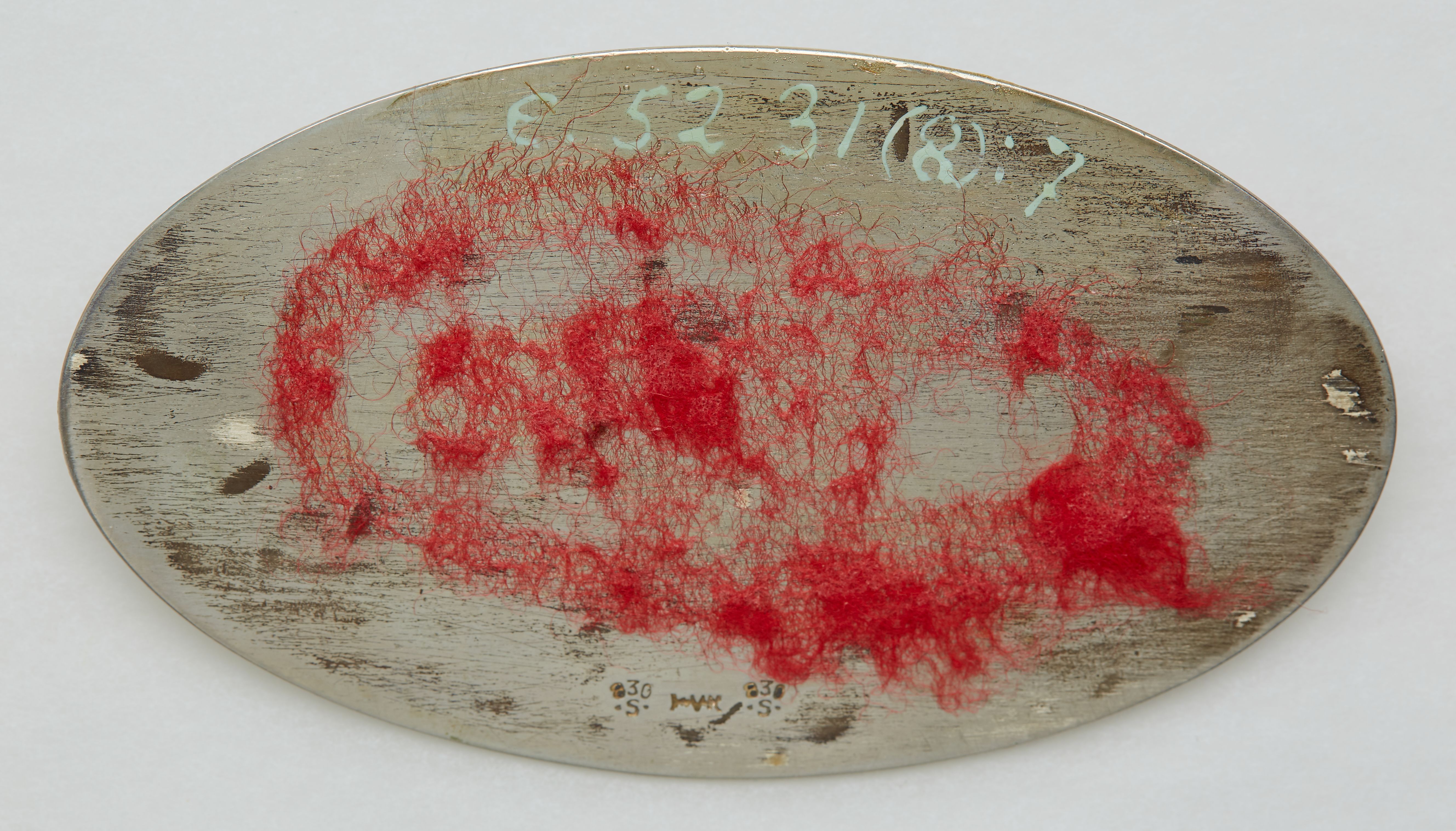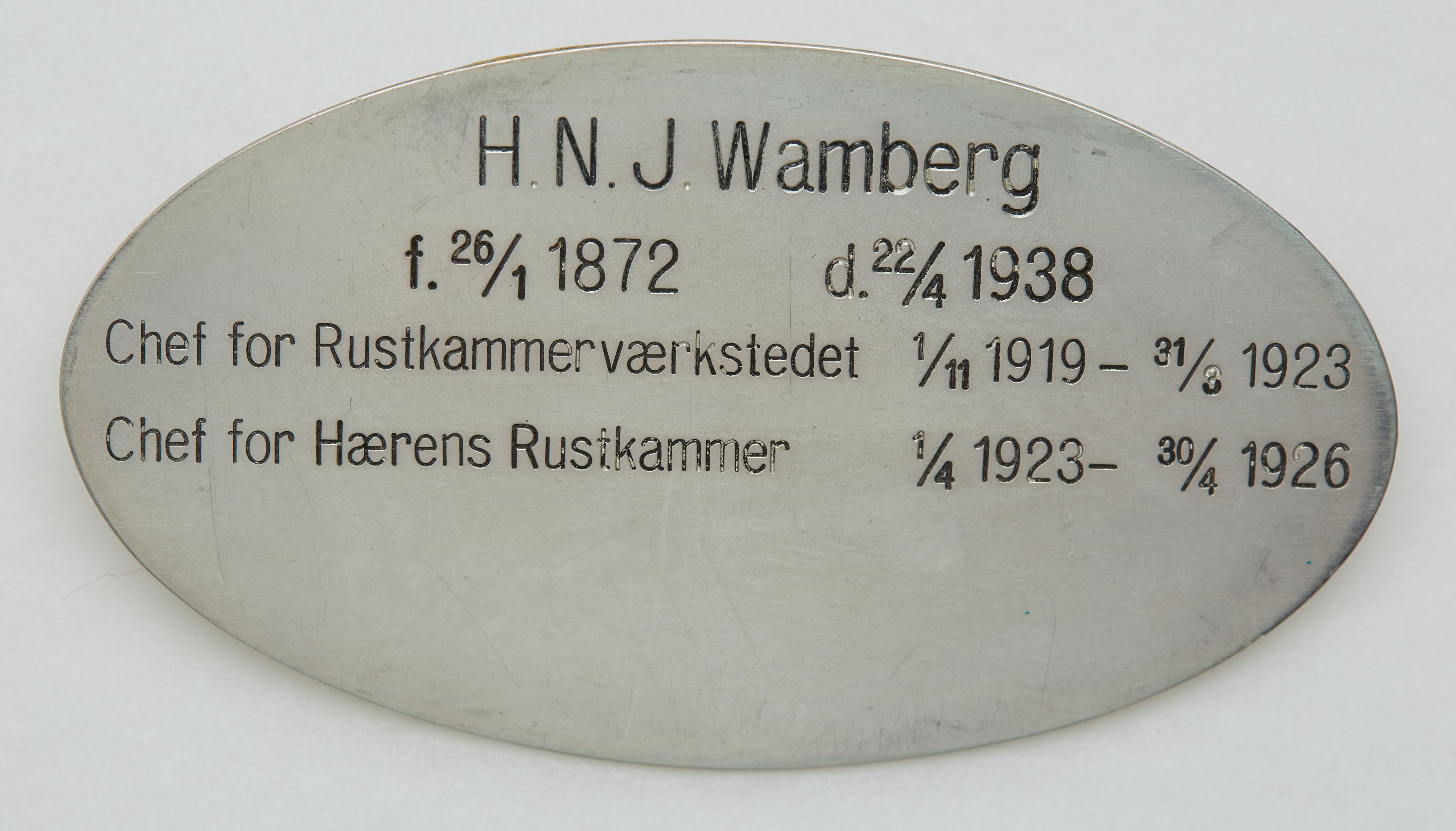 "Sølvplakette, der har siddet på fotografi. Disse blev smidt ud da Våbenarsenalet ophørte, men giver gemte plaketterne.\nOval plade.\nIndskrift: \"H.N.J. Wamberg f. 26/1 1872 - d. 22/4 1938. Chef for Rustkammerværkstedet 1/11 1919 - 3173 1923. Chef for Hærens Rustkammer 1/4 1923 - 30/4 1926\"",