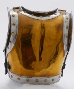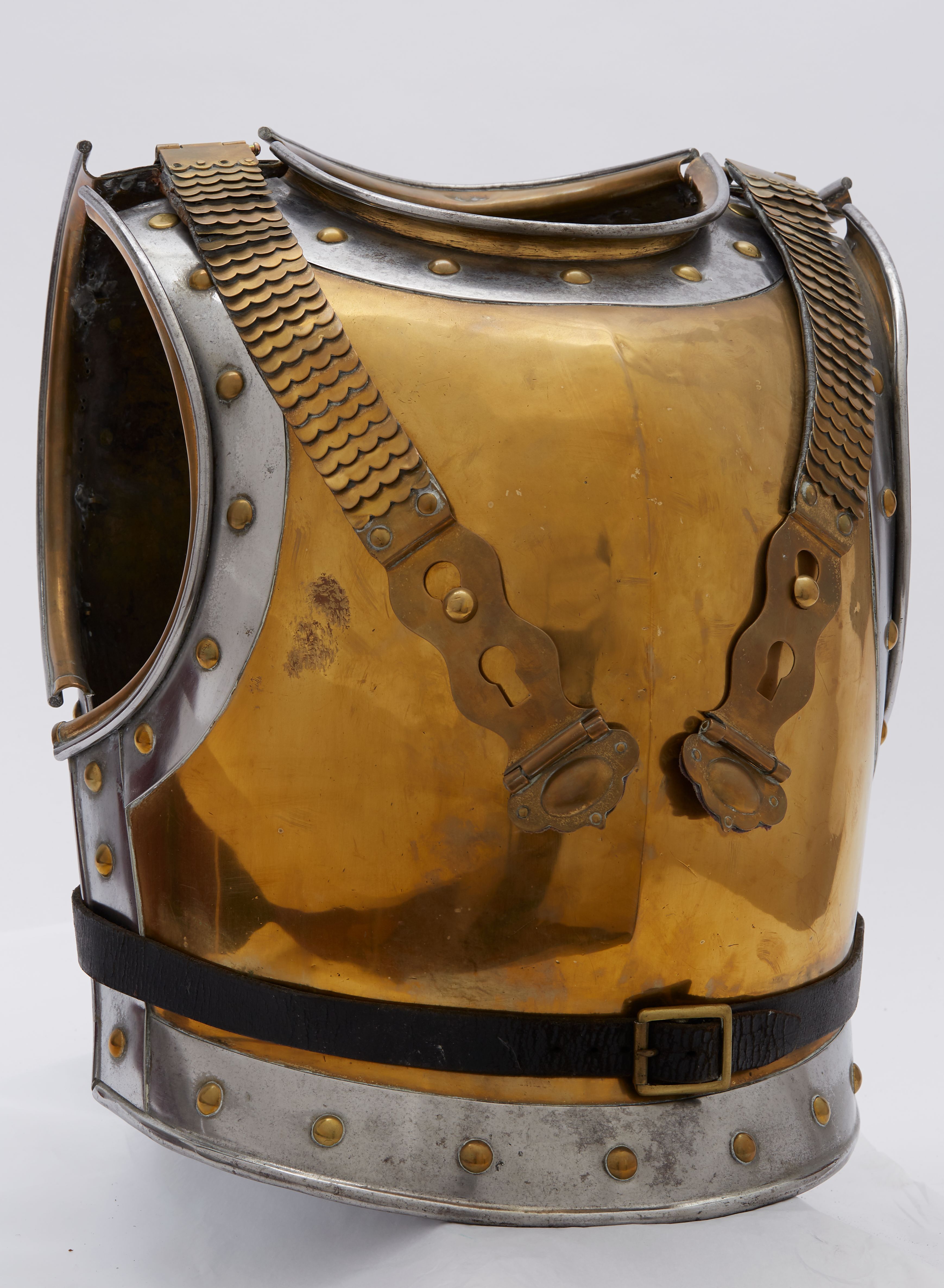 "Kyras M/1832 for underklasserne af Livgarden til Hest. Taget i brug 1833. Erstattet af M/1856.\nFra Beholdningen.\n\nBryst- og rygplade. Hvidt metal, med messing på det meste af brystet og ryggen, kanter med store messingnagler. Skulderremme med schupper. Uden kyrasskjorte. Med maverem af sort læder med dornspænde."
